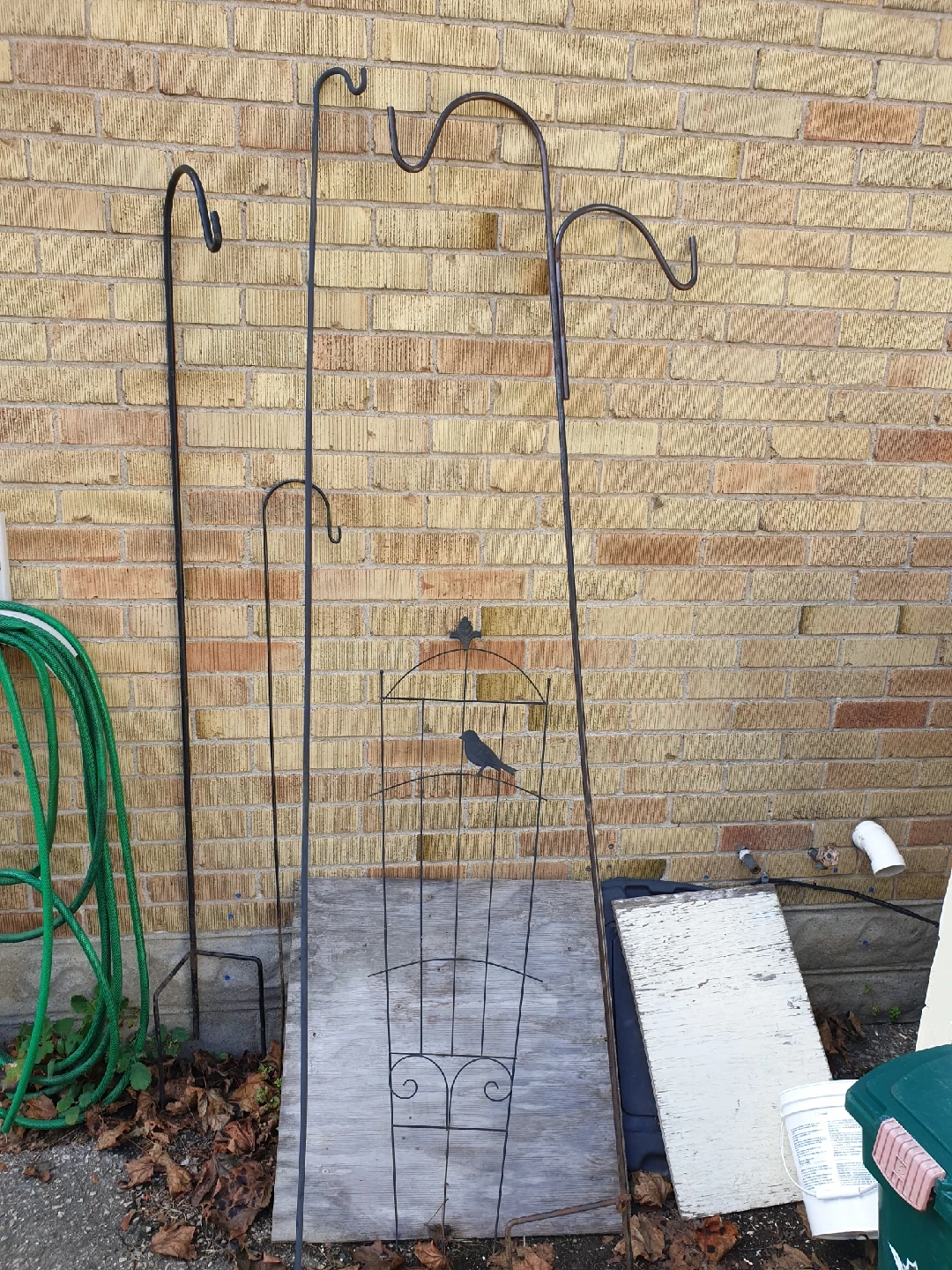 Enhance your garden with this set of used decorative metal pieces, perfect for adding a touch of rustic charm! This set includes three shepherd's hooks of varying heights, ideal for hanging plants or lanterns. Also featured is a trellis, adorned with a charming metal bird, ready to support your climbing plants. Unfortunately, I'm not a mind reader, so if this ad is up, it's still available! $30.00 for all.