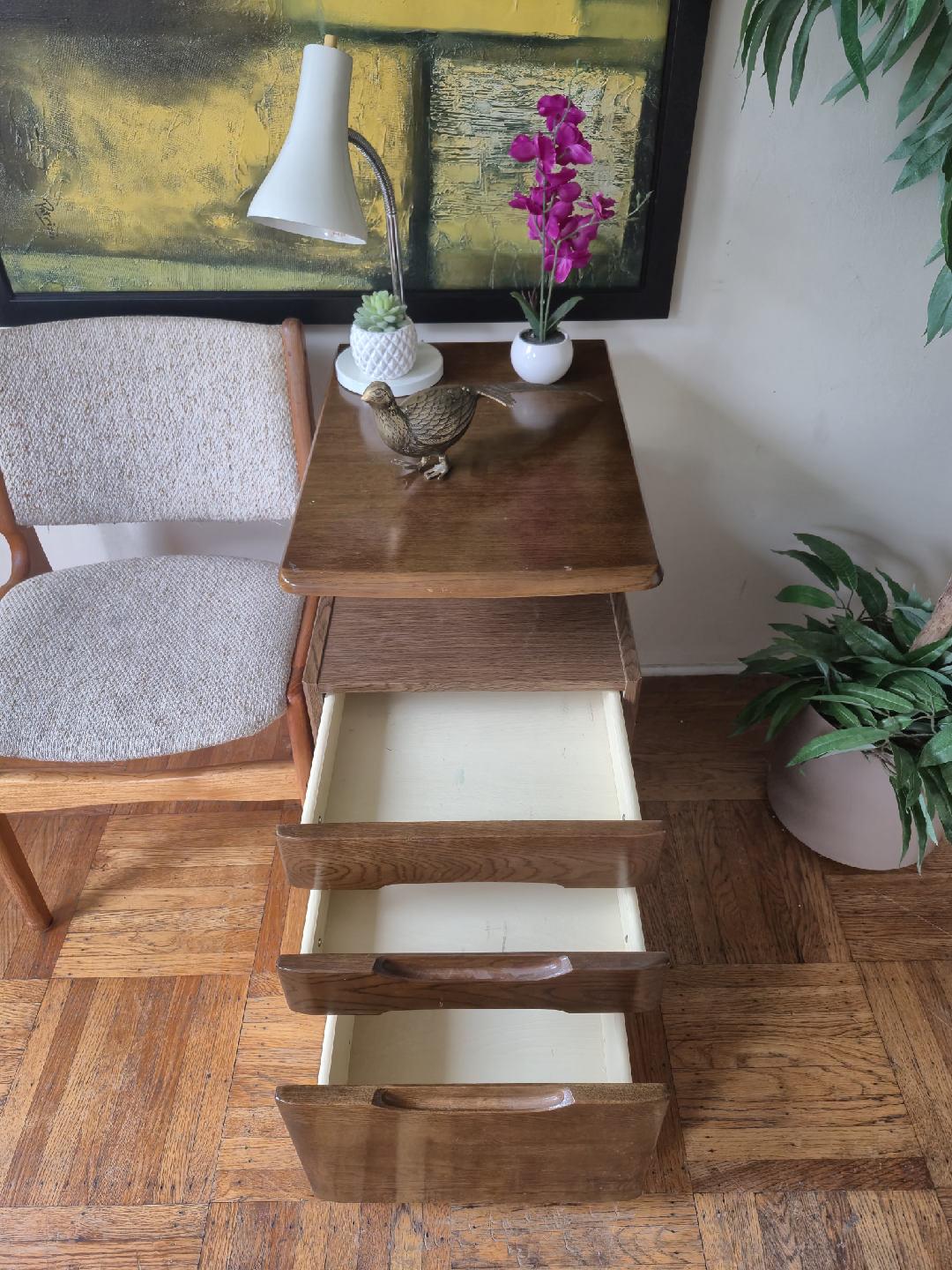 Stylish and practical side table with a clean, modern wood design. Three drawers with sleek integrated handles. Lift-up top surface adds extra function — great for a laptop, reading, or serving table.
