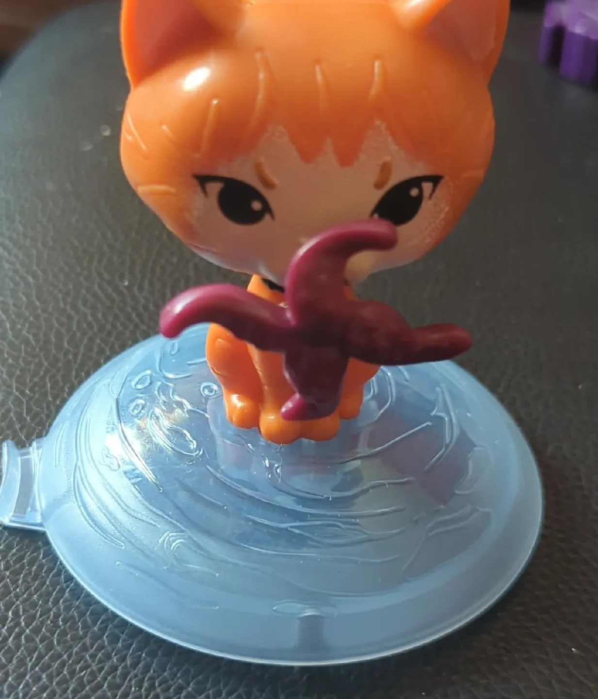 Selling a cute orange cat figurine! It's sitting on a clear blue base and holding a small purple bird. It would be a nice addition to any collection
