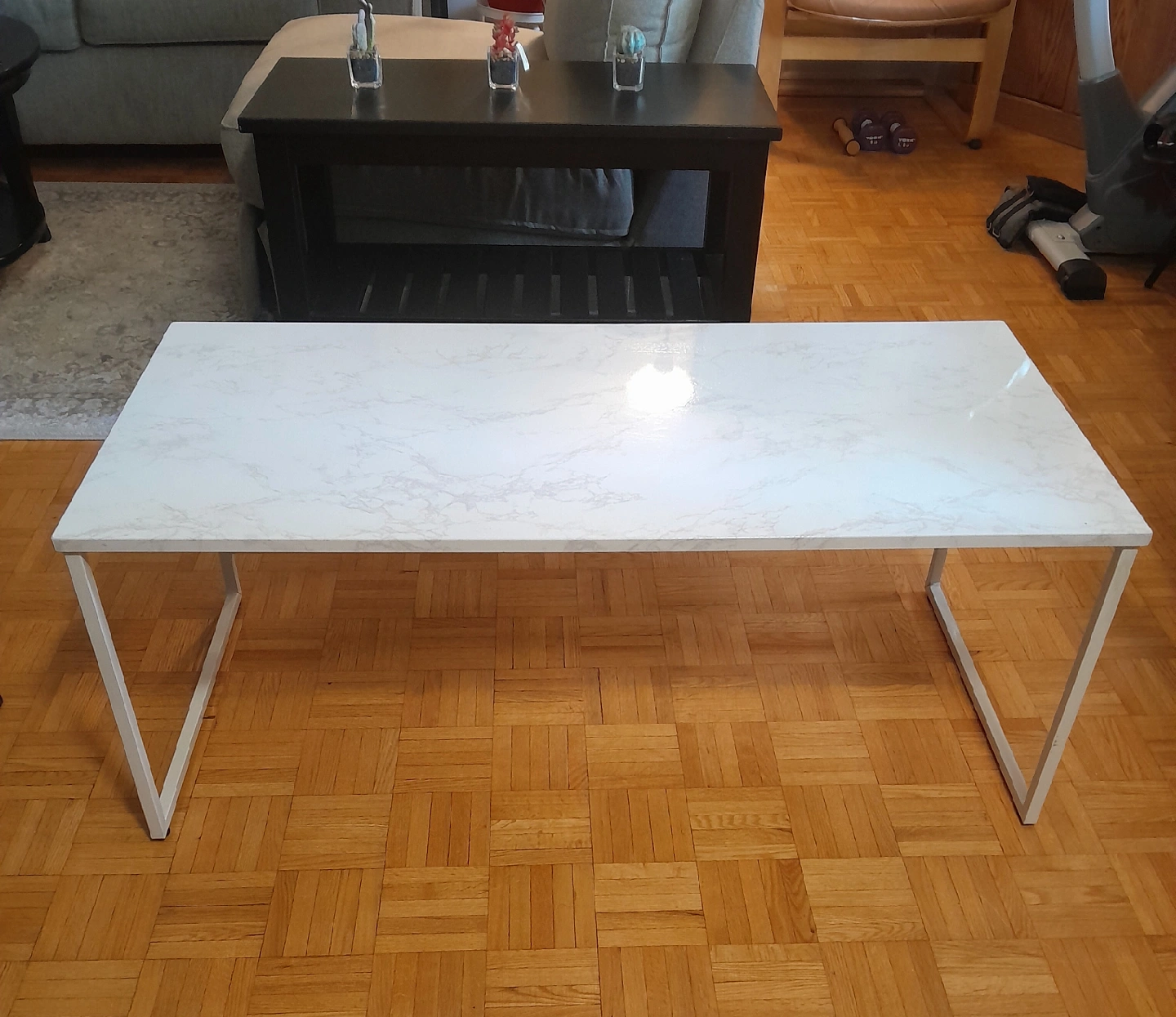 Selling a coffee table with a marble-look top. It's in great shape and would look lovely in any living room! The table has a clean, modern design with sturdy legs.