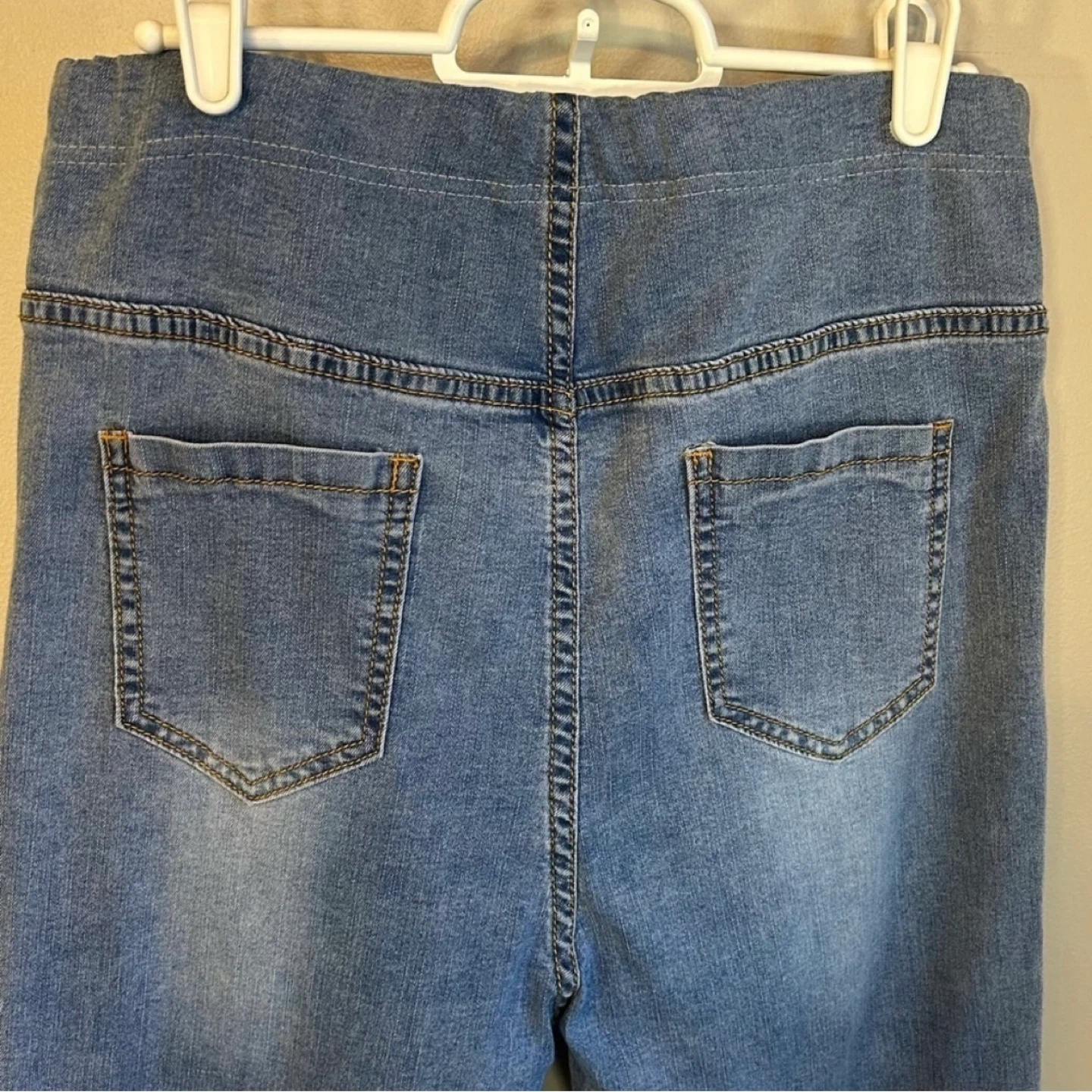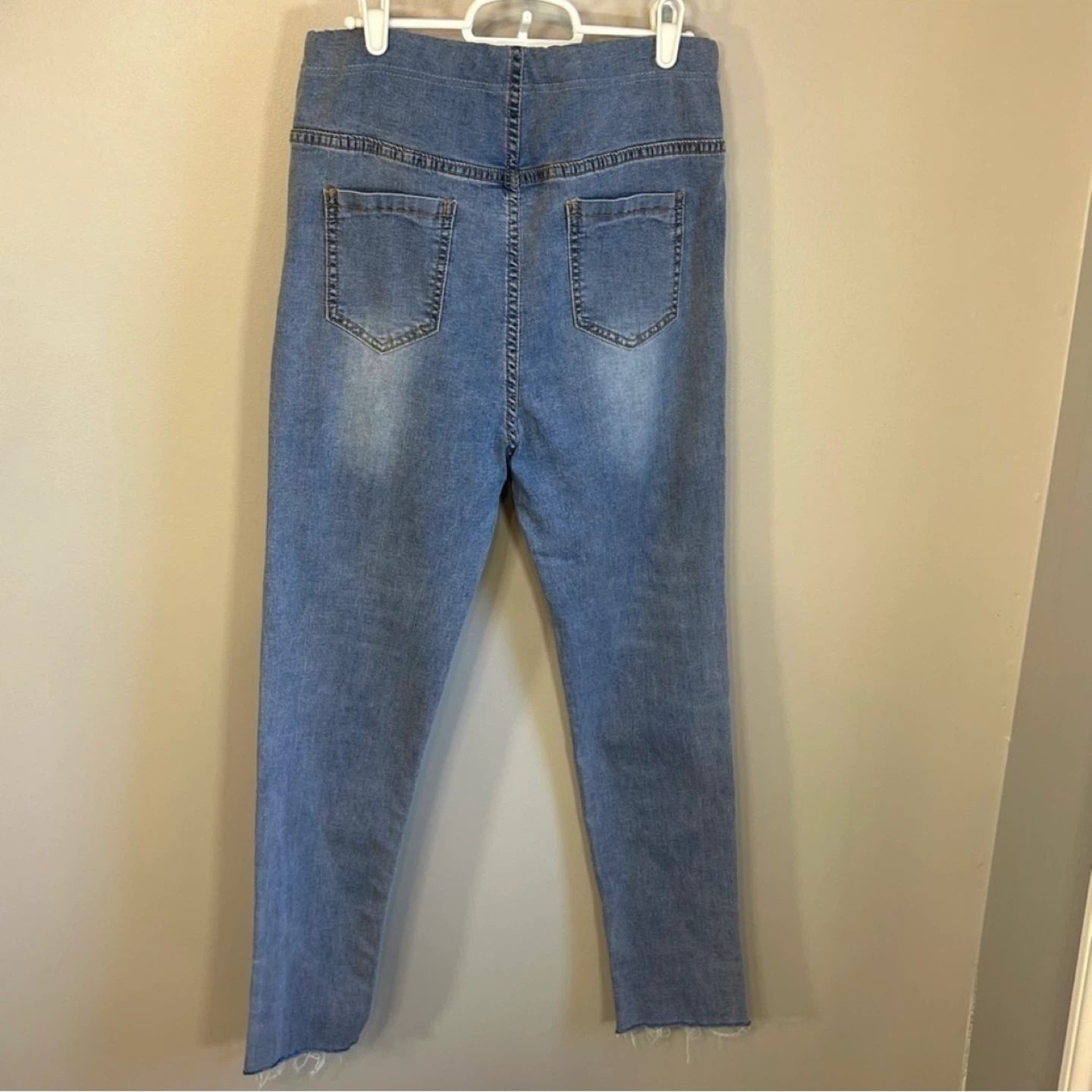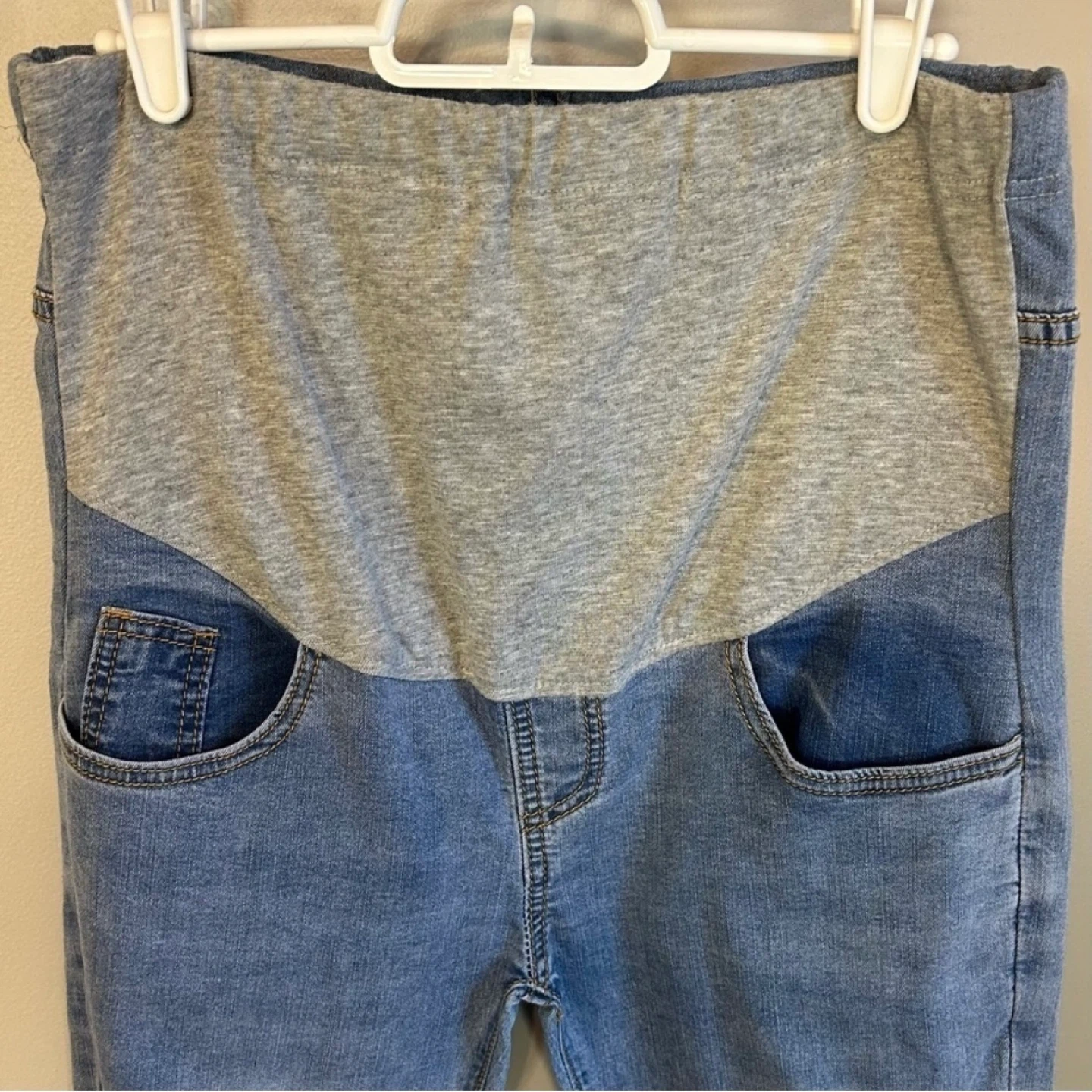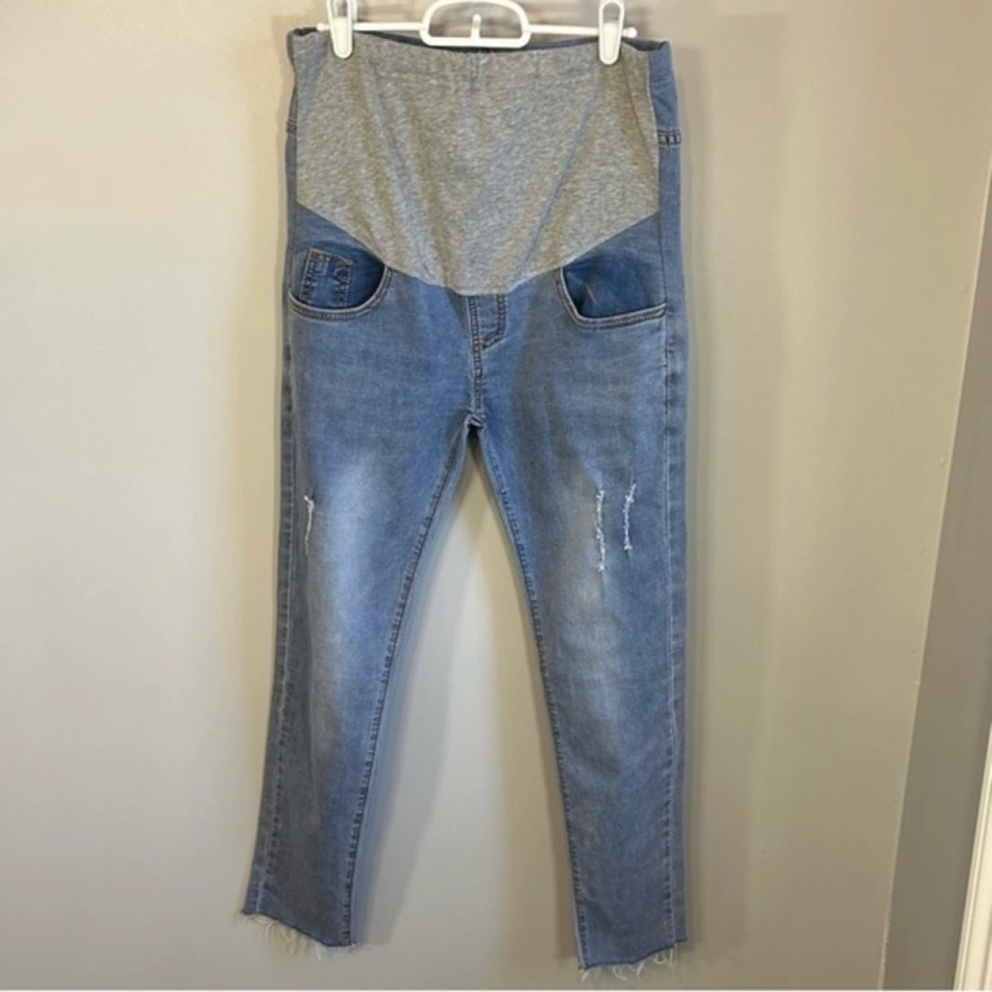 Medium wash over bump maternity jeans from PatPat. Distressing at thighs and raw edge cuffs. 5 pocket design. Adjustable elastic at waist. Tag says size XL but they fit more like a women’s size 10. Worn only a few times. Cross posted.