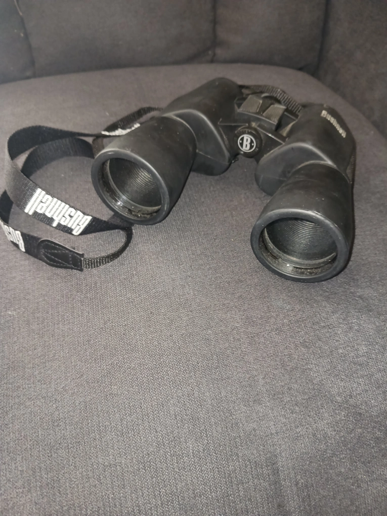 Selling a pair of Bushnell binoculars. They are black and come with a strap. Great for bird watching or other outdoor activities!