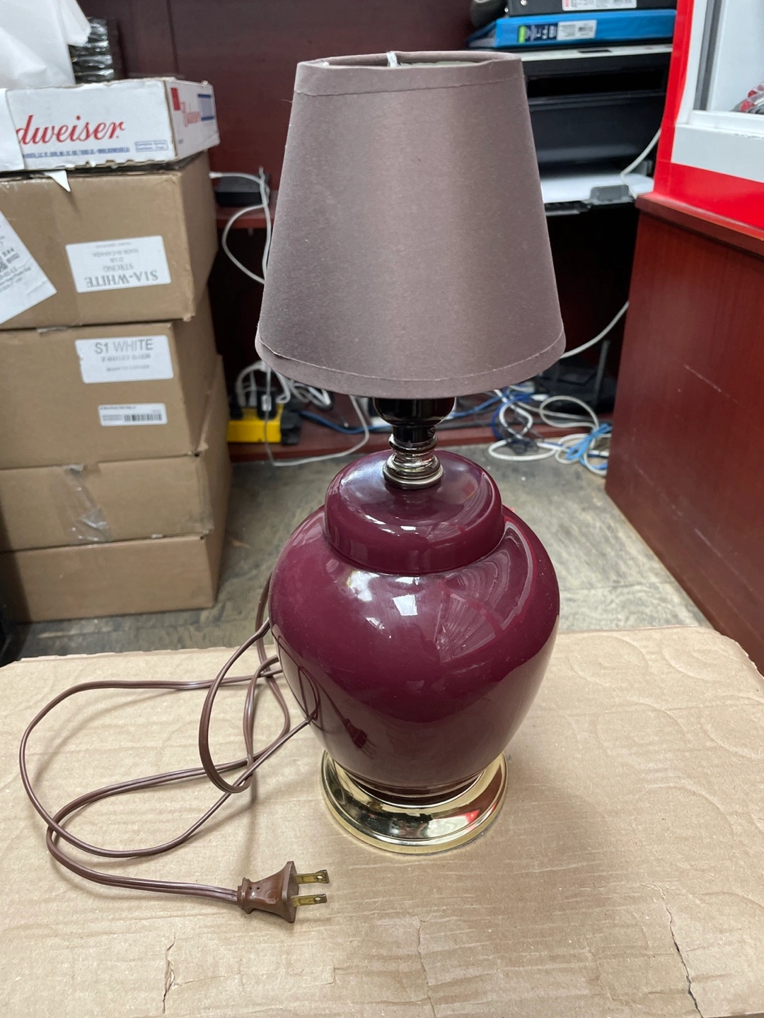 A lovely burgundy table lamp with a brown shade. It's in great shape and would look perfect on a bedside table or desk. The base has a gold accent. First come, first served.