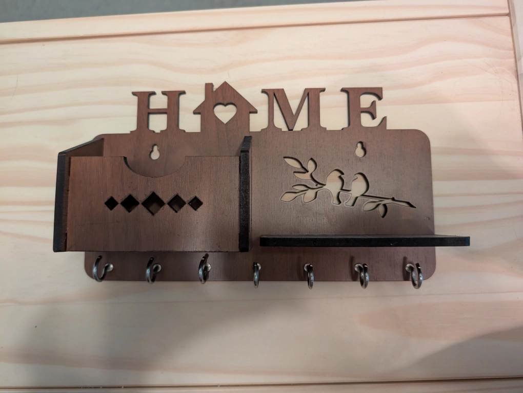 Keep your keys and mail organized with this cute wooden holder! It has a spot for mail and a row of hooks for keys. The design features the word 'HOME' with a heart detail and a bird illustration Pick up or able to meet at a TTC station!