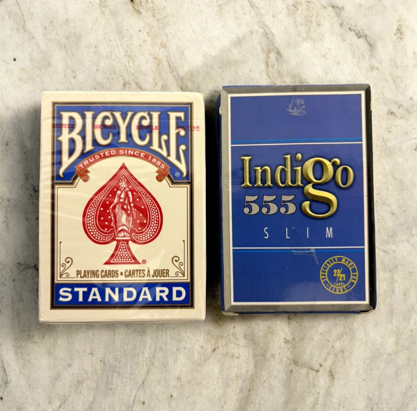 Selling two new decks of playing cards! One is a Bicycle Standard deck, trusted since 1885. The other is an Indigo 555 Slim deck. Both are sealed and ready for your next game night.