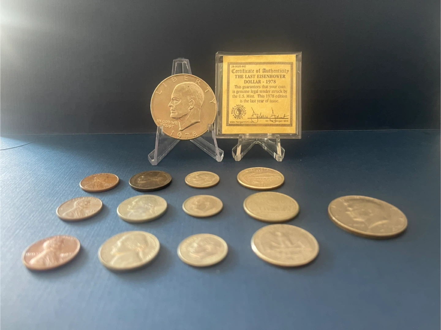 Mini US lot with 2 commemorative quarters (Colorado, Washington), a Jefferson Wartime Nickel from 1943 (35% silver), and the last Eisenhower dollar from 1978 with a COA in an almost uncirculated condition!