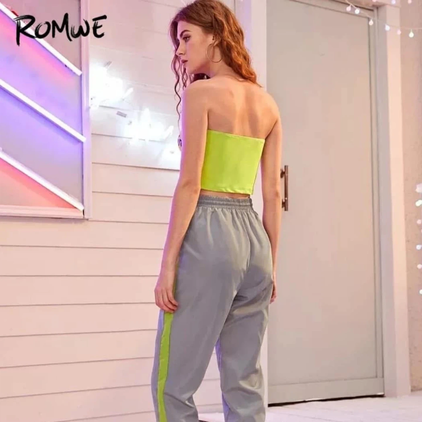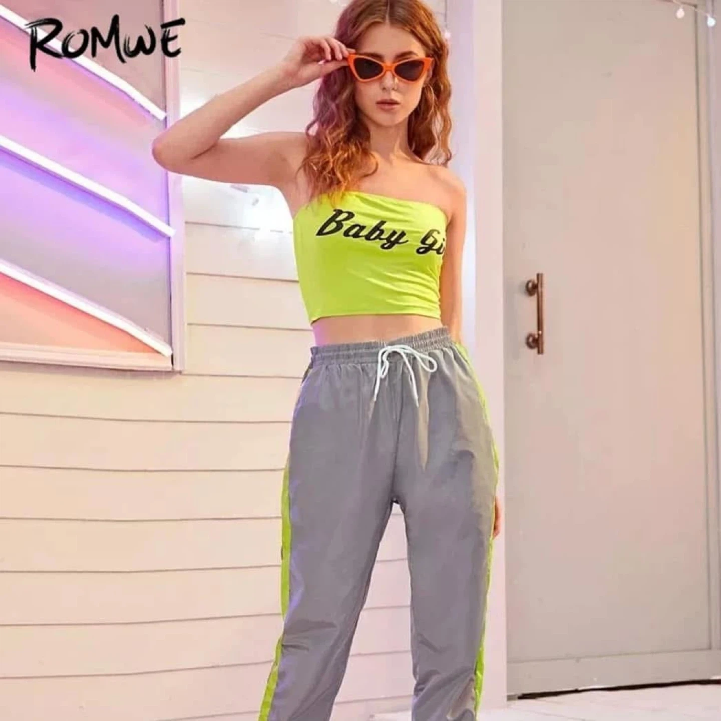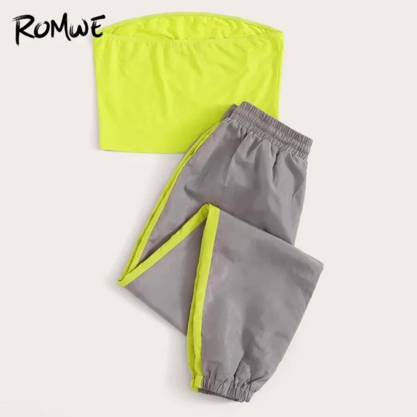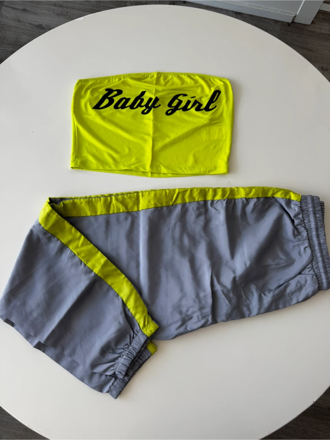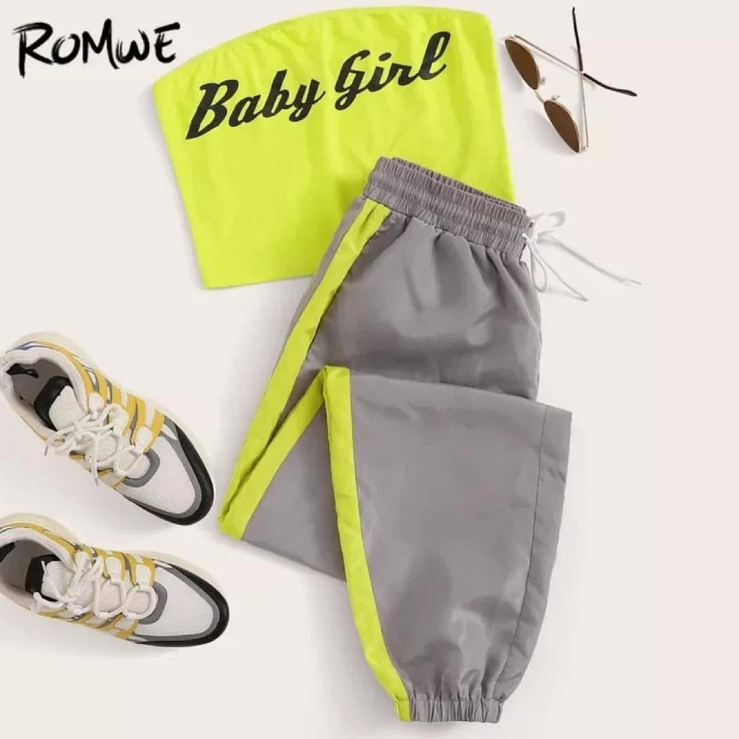 Selling a Romwe two-piece set that includes a neon yellow tube top with 'Baby Girl' printed on the front and a pair of grey track pants with neon yellow stripe detailing. This set is perfect for casual wear or lounging around the house. It's in great condition and ready for a new home!