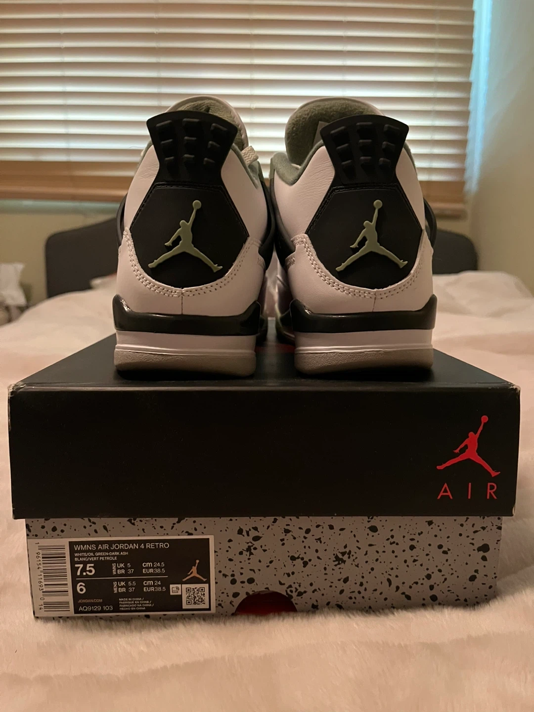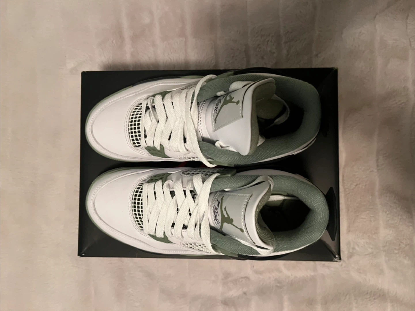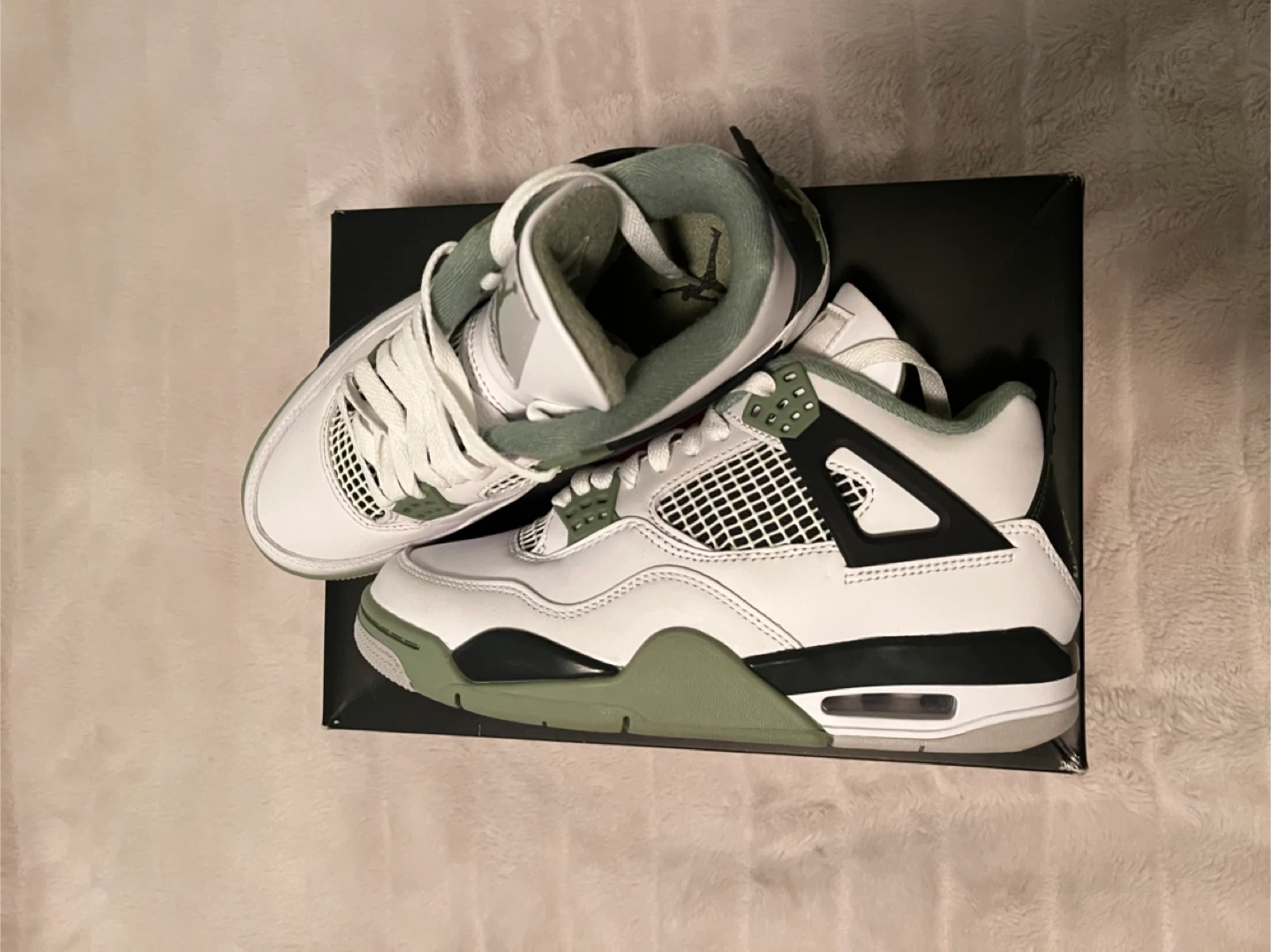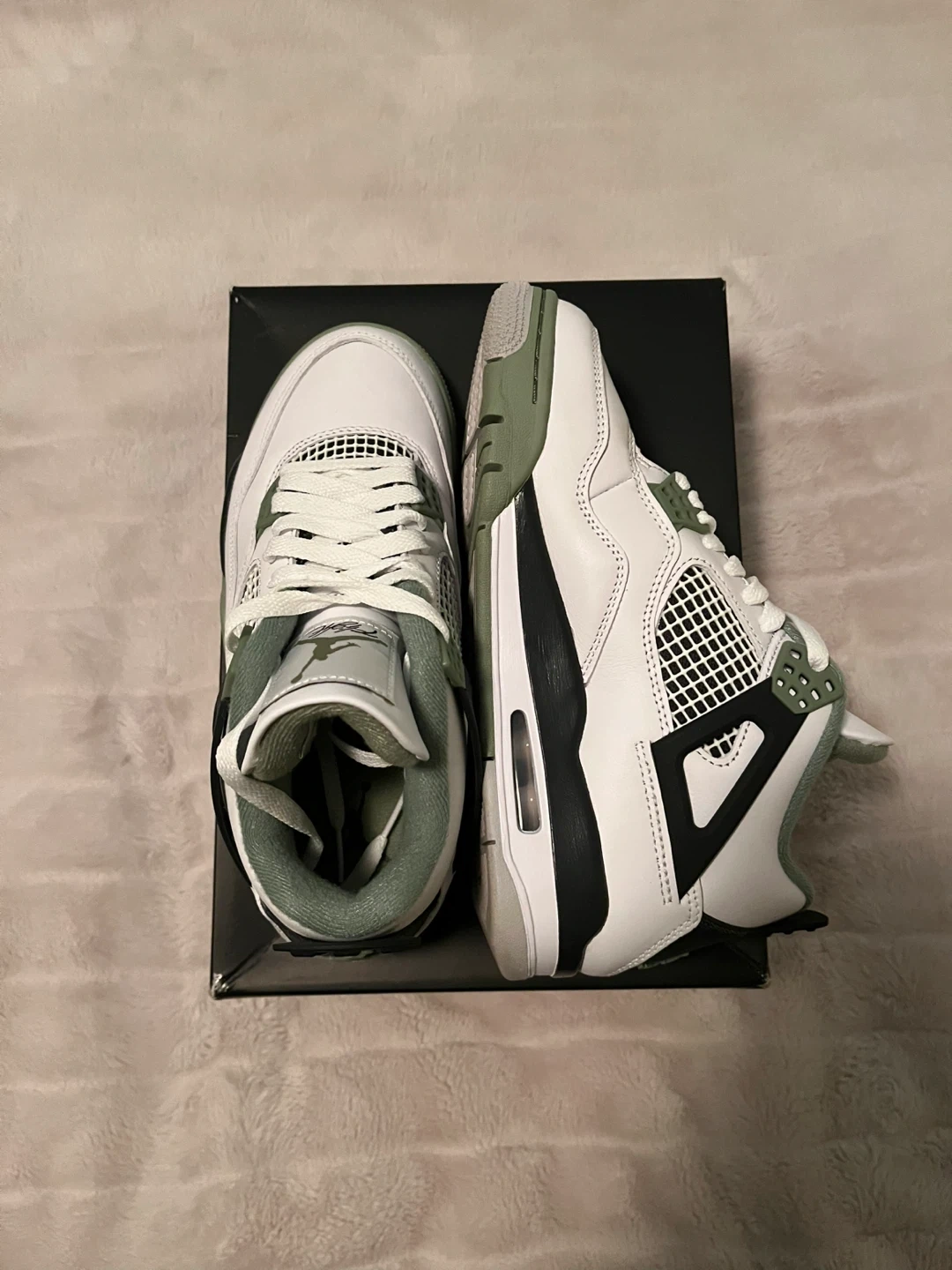 Selling a pair of Air Jordan 4 Retro sneakers in the Seafoam colourway! They are a women's size 7.5 and come with the original box. The shoes are in great condition (only worn once!) and ready for a new home.