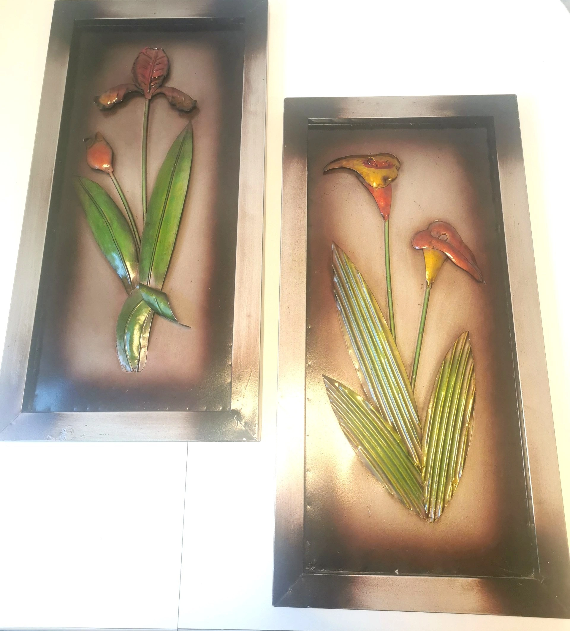 For Sale: Vintage Mid-Century Modern Floral Steel Wall Art Panels These beautiful, hand-crafted steel floral art panels feature intricate relief designs of stylized flowers. The pieces showcase a striking blend of metallic hues and detailed floral motifs. Likely created during the mid-20th century, these artworks add a timeless and elegant touch to any space. Perfect for collectors of vintage home decor or those looking to add a unique statement piece to their home. Condition: Good vintage condition with expected light wear please reference photos as part of the description. Material: High-quality steel with a glossy finish. Dimensions: Length 26 inches, Width 10.25 inches, Height 1 inch Era: Mid-Century Modern (likely 1950s-1970s). Style: Floral relief, vintage industrial decor. Perfect for: Home, office, or vintage-themed interior. Add a touch of vintage charm to your decor with these timeless steel flower panels!