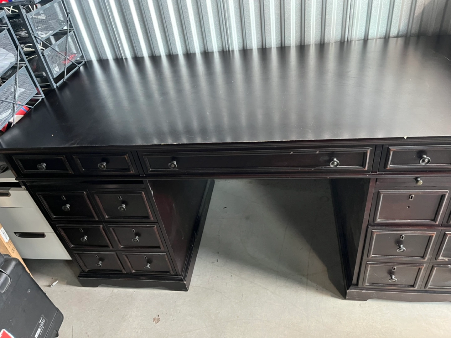 Selling a dark wood executive desk. It features multiple drawers for ample storage on either side. Perfect for a home office or study space!