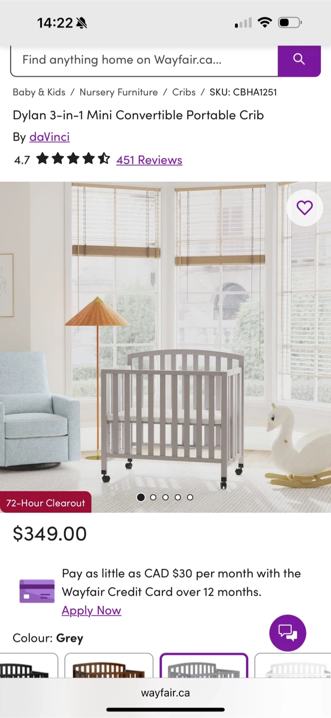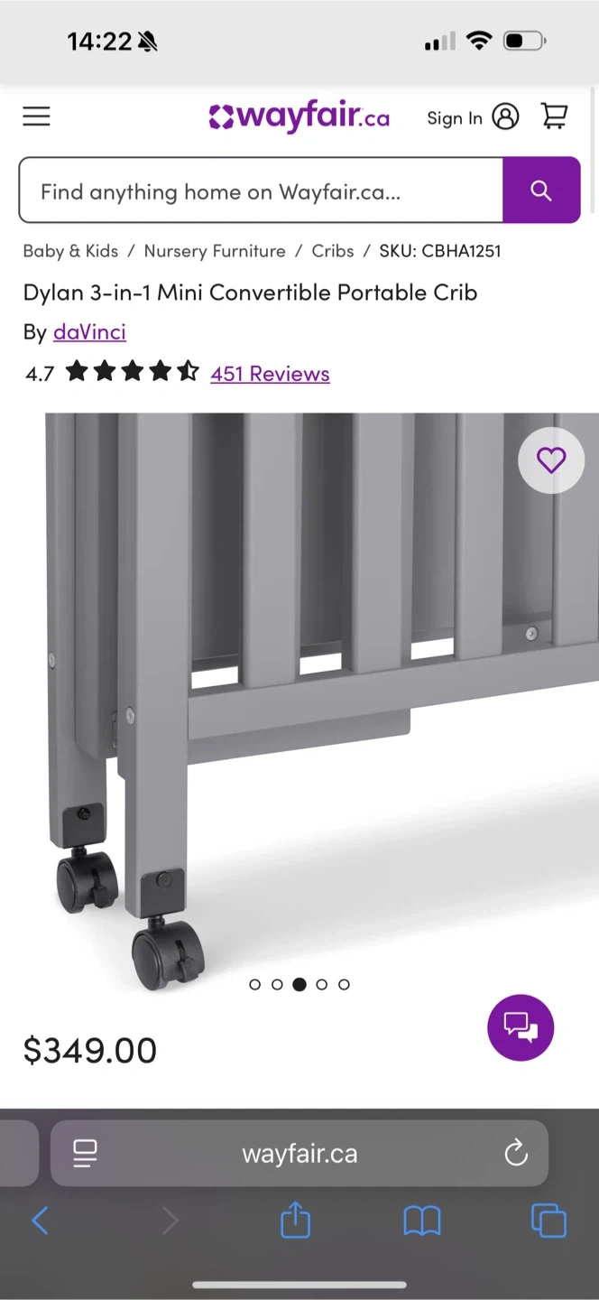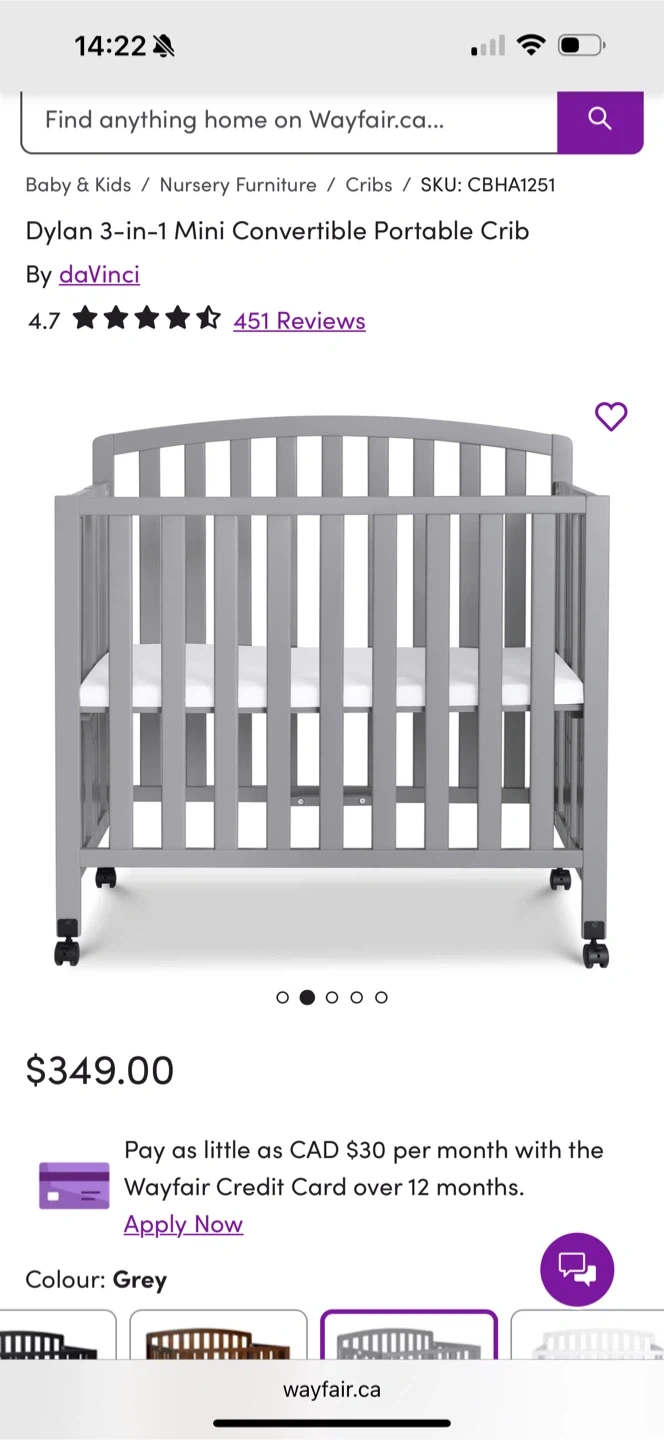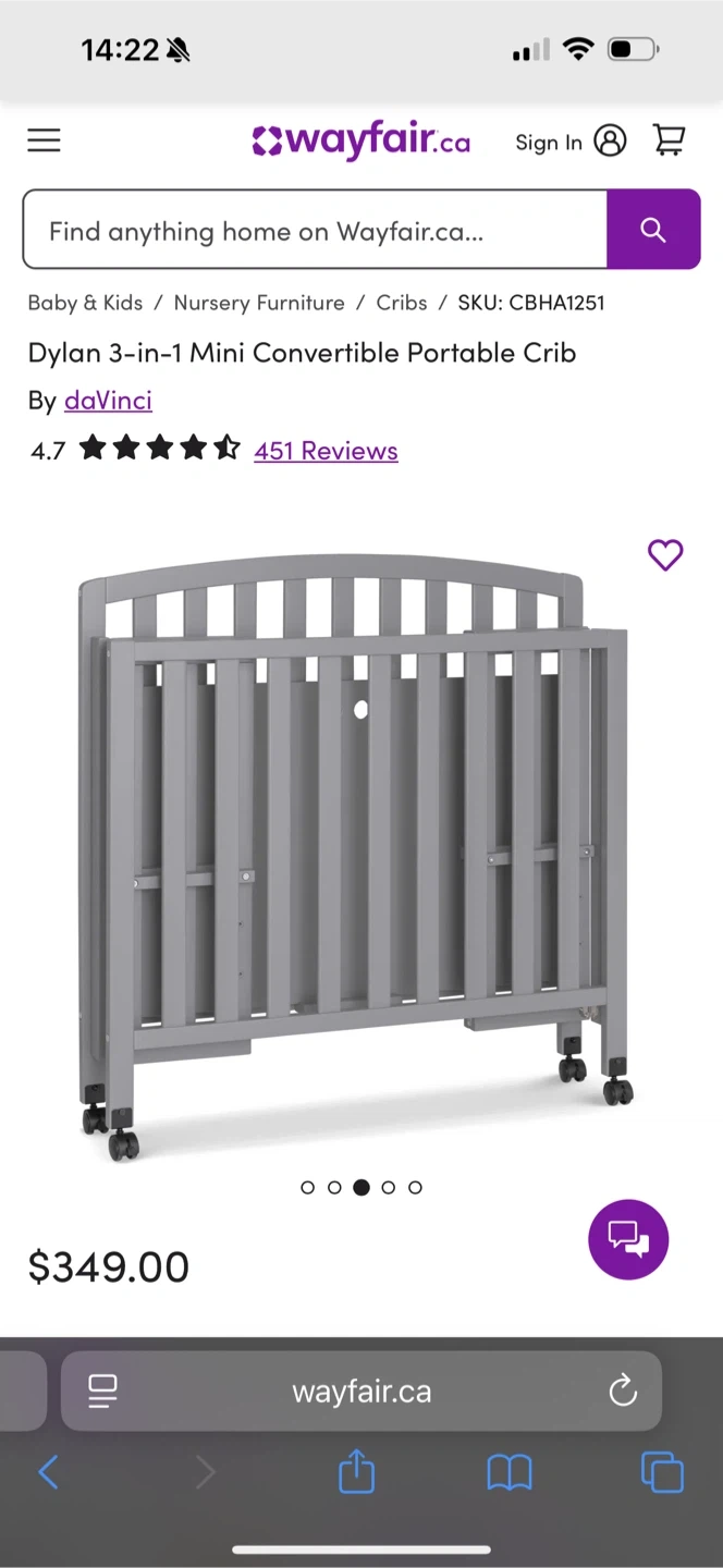 Selling a DaVinci Dylan 3-in-1 mini convertible portable crib in grey. This crib is perfect for smaller spaces and can convert as your little one grows! Originally bought for $349. It's in great condition, we only used it for about a month! Comes with the mattress as well.