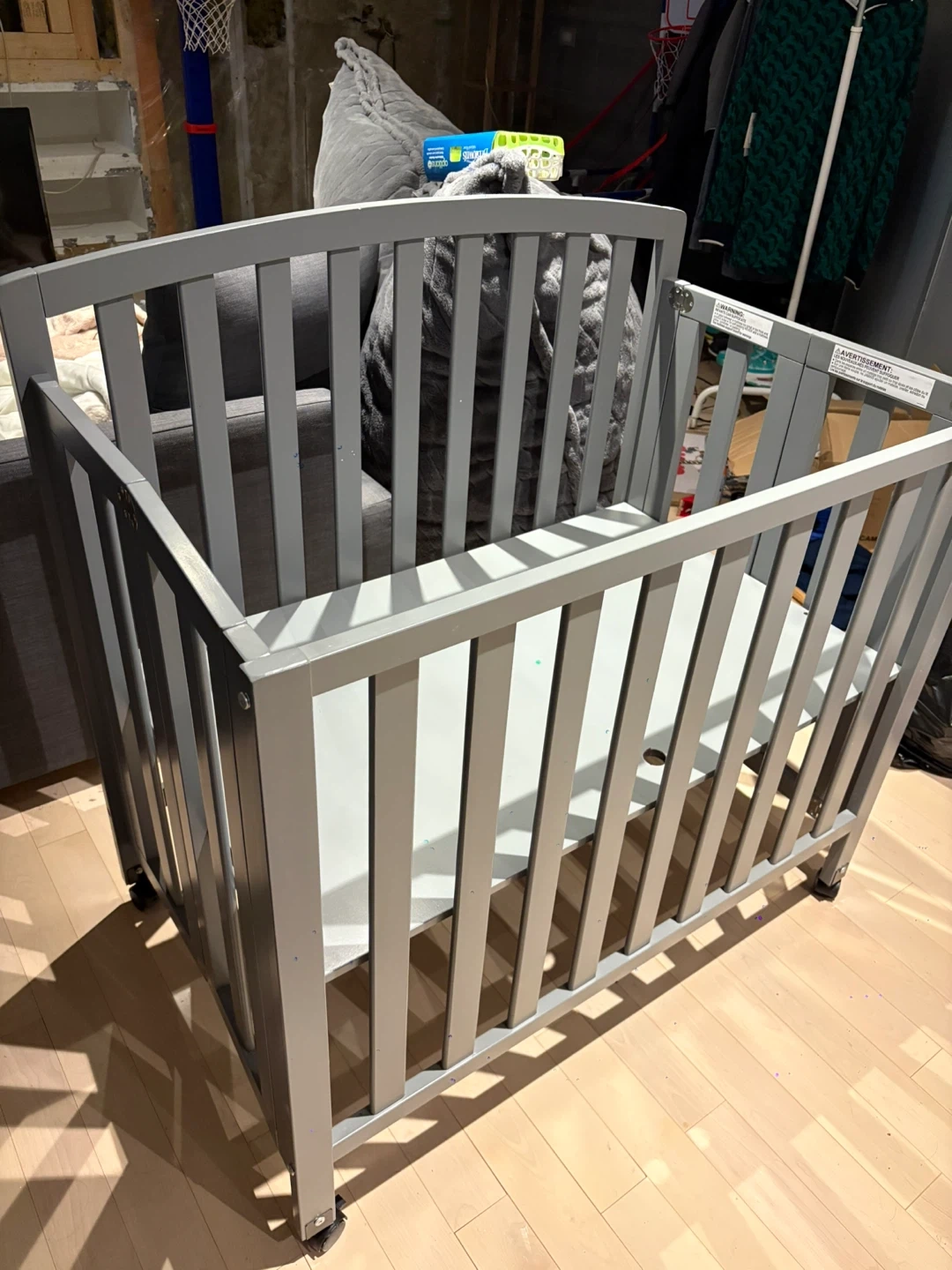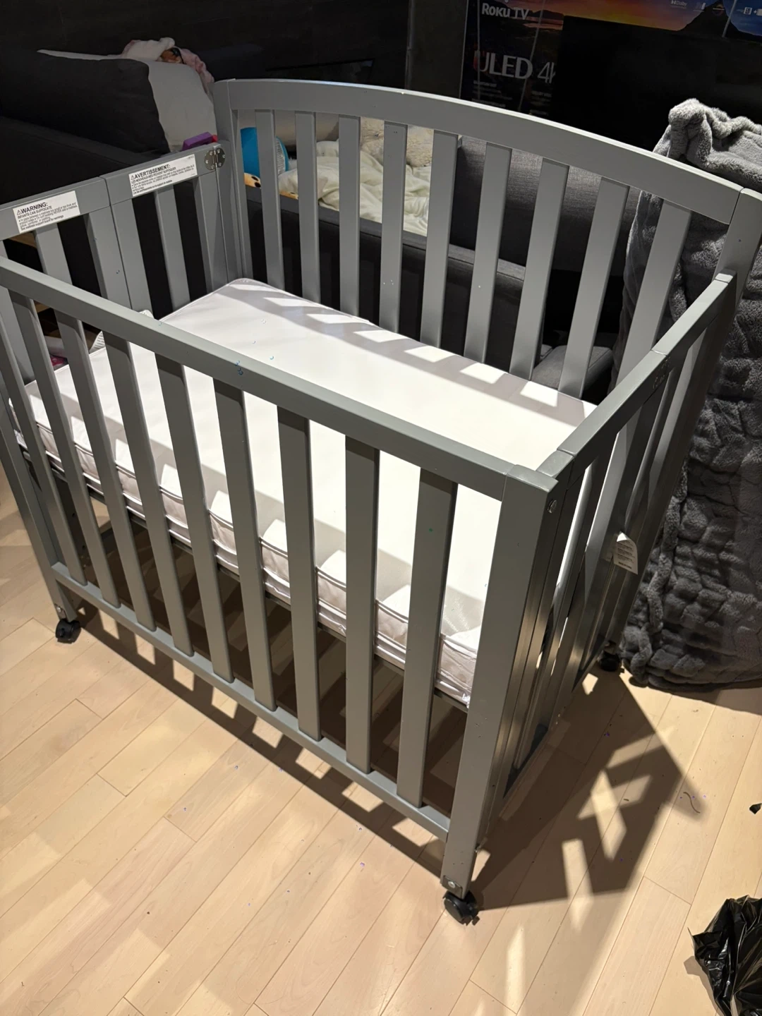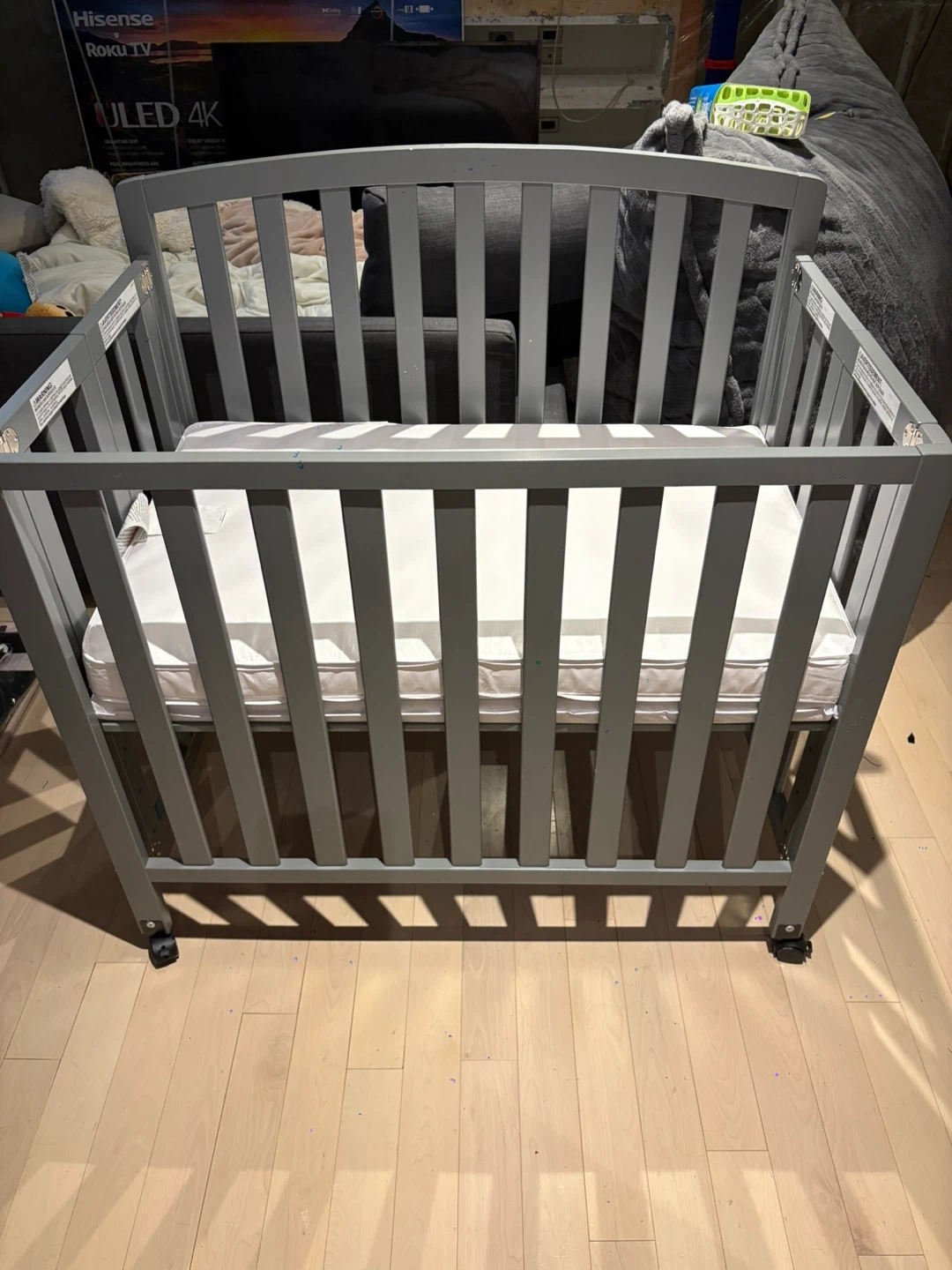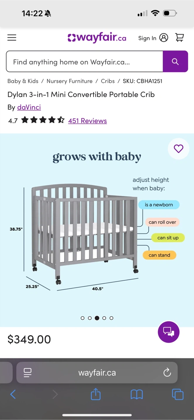Selling a DaVinci Dylan 3-in-1 mini convertible portable crib in grey. This crib is perfect for smaller spaces and can convert as your little one grows! Originally bought for $349. It's in great condition, we only used it for about a month! Comes with the mattress as well.