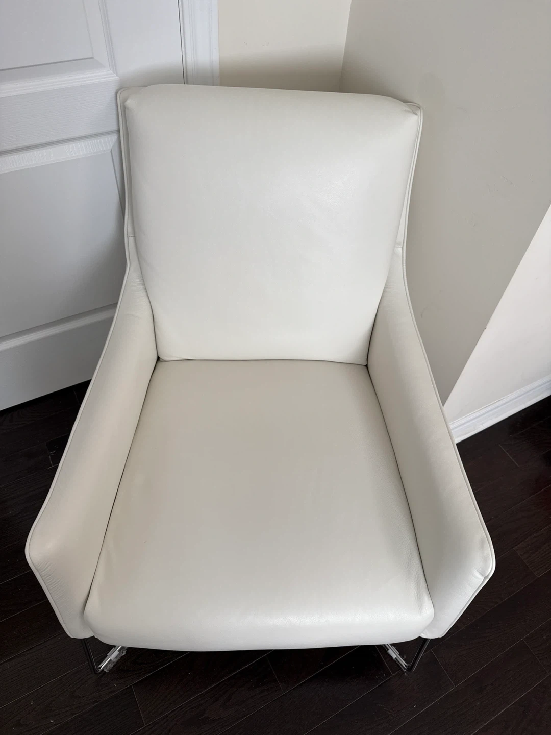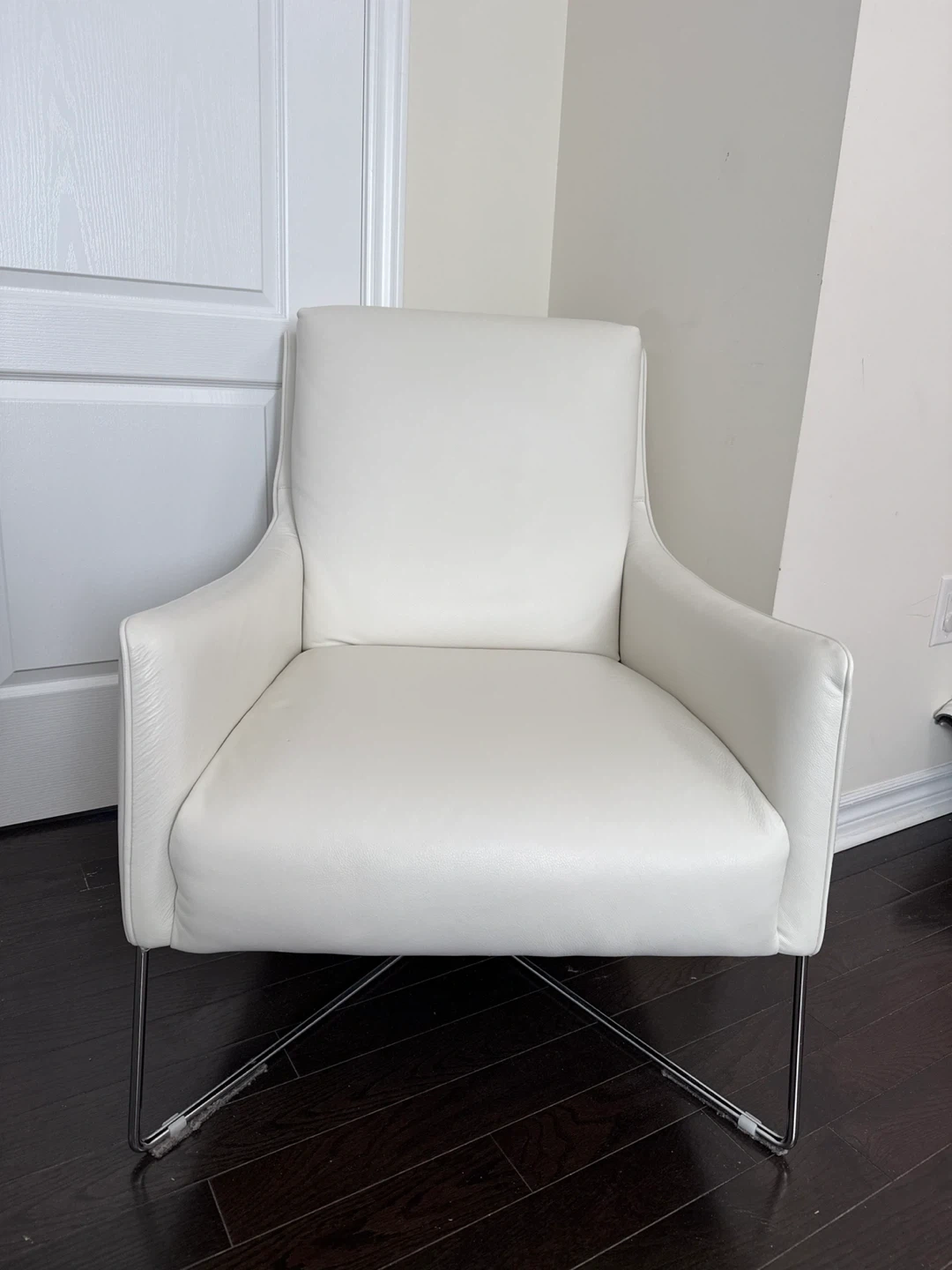 Selling a stylish white leather accent chair! It's in great condition and would look lovely in any living room or bedroom. The chair features a sleek design with chrome legs, adding a touch of modern elegance to your space