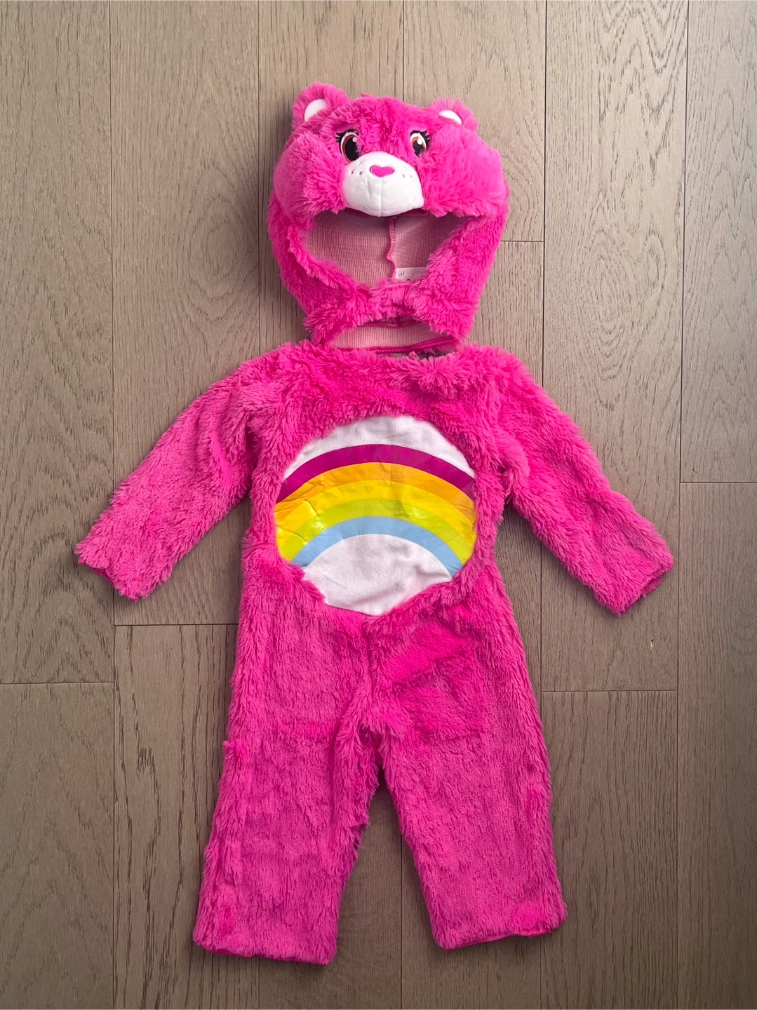 Super cute Care Bears (Cheer Bear) costume in a vibrant pink! This cozy costume includes a hood to keep your little one warm. Perfect for dress-up or Halloween! Size 2T snug.