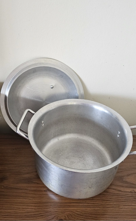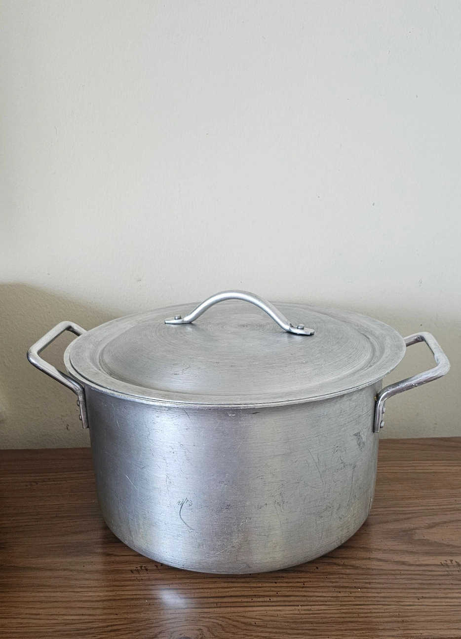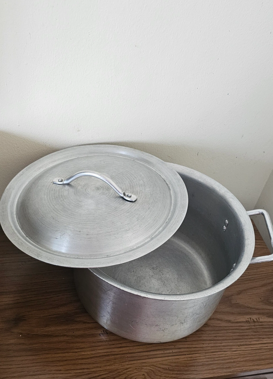 Selling a large aluminum stock pot, complete with its lid! It's perfect for making big batches of soup, stew, or anything else you can imagine. It has a good amount of space inside, and the handles make it easy to carry around the kitchen