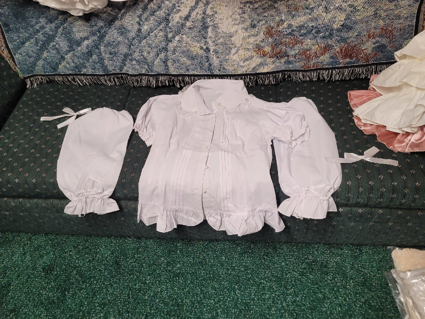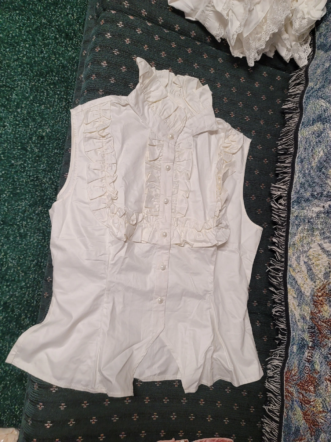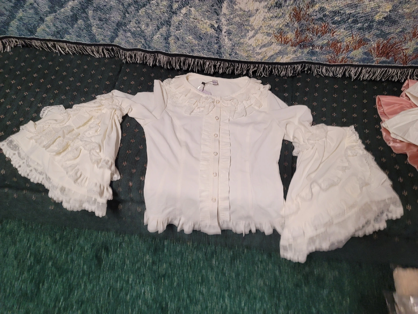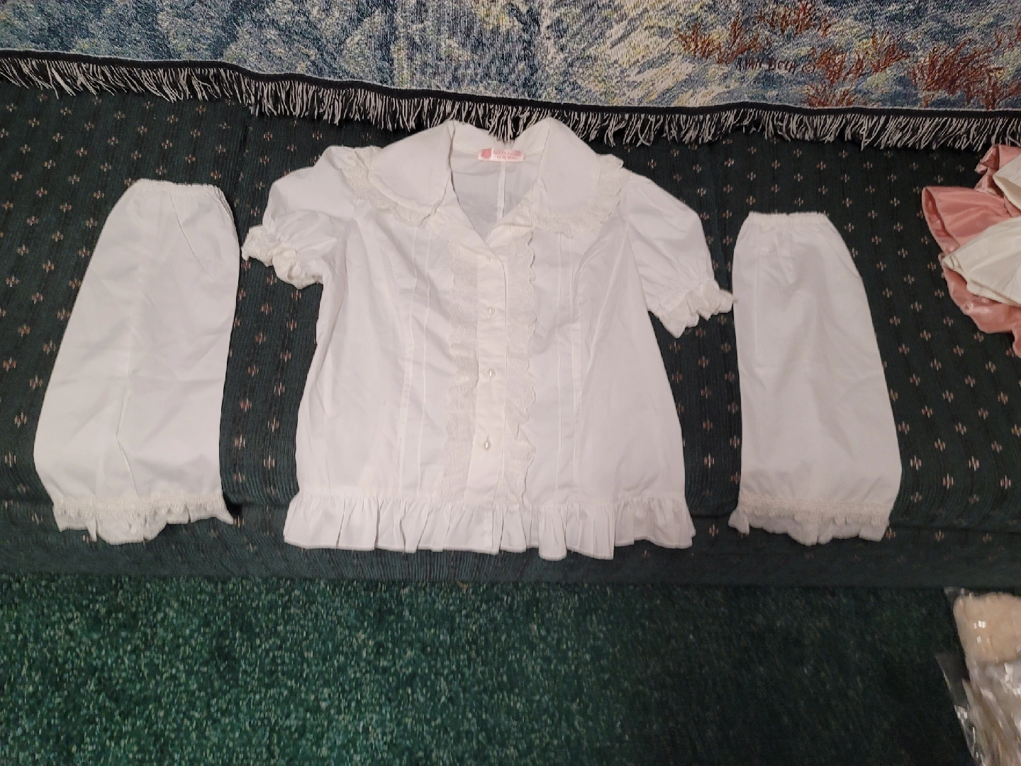 Selling a cute white Lolita style blouse! It features a ruffled collar and front, and comes with detachable sleeves for different looks. Perfect for adding a touch of sweetness to your wardrobe. Blouse w/long big, poofy sleeves = $100 Blouse w/long big, poofy sleeves + Bows = $110 Blouse w/long poofy sleeves = $80 Sleeveless Blouse = $20 Blouse w/sleeves = $30 Better Quality Blouse w/sleeves = $50 See-through Sleeves Blouse = $60 Long-Sleeve Blouse w/Bows (next to the white skirt) = $100