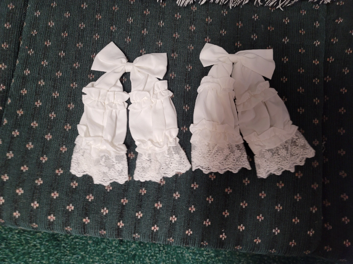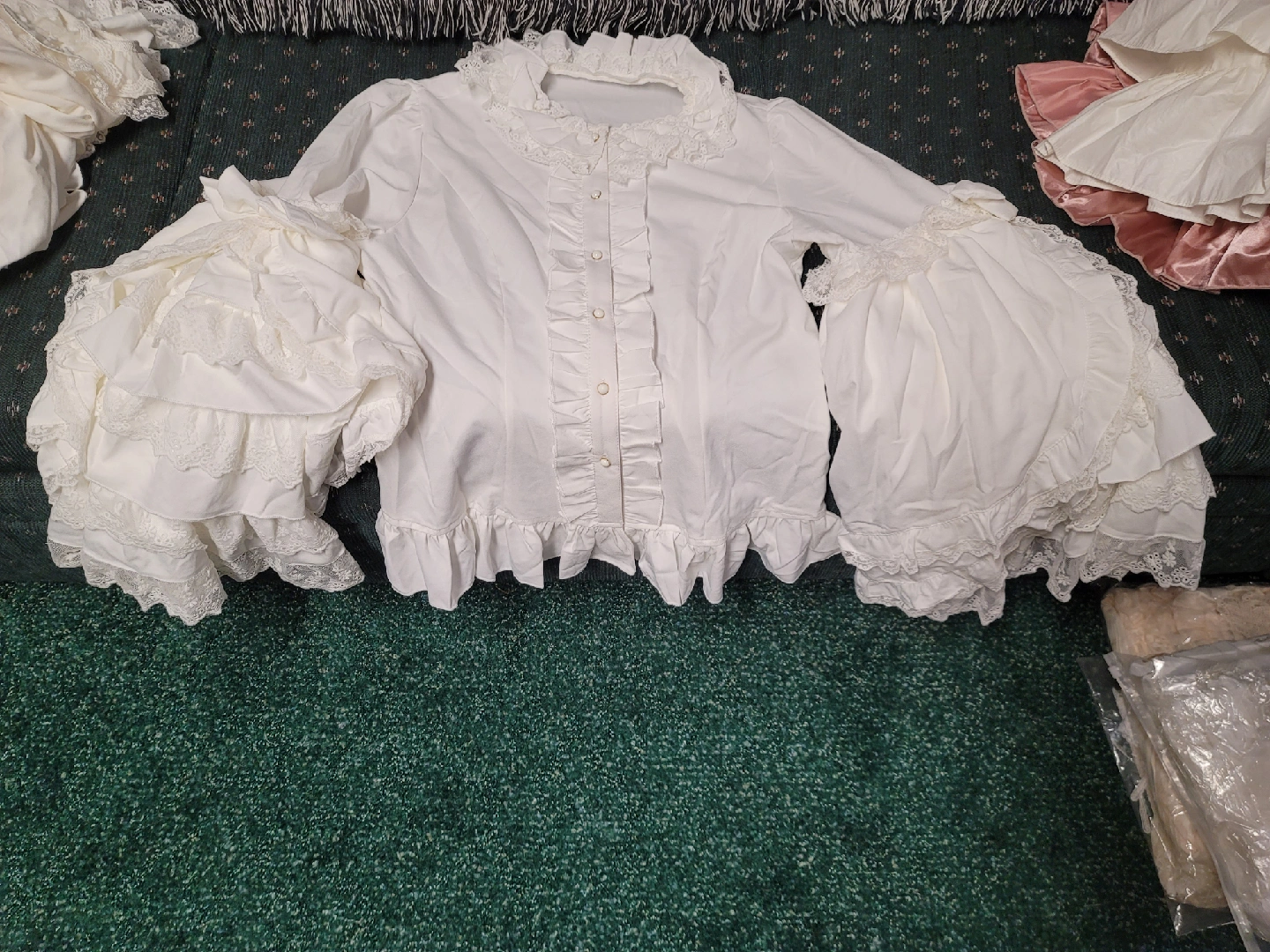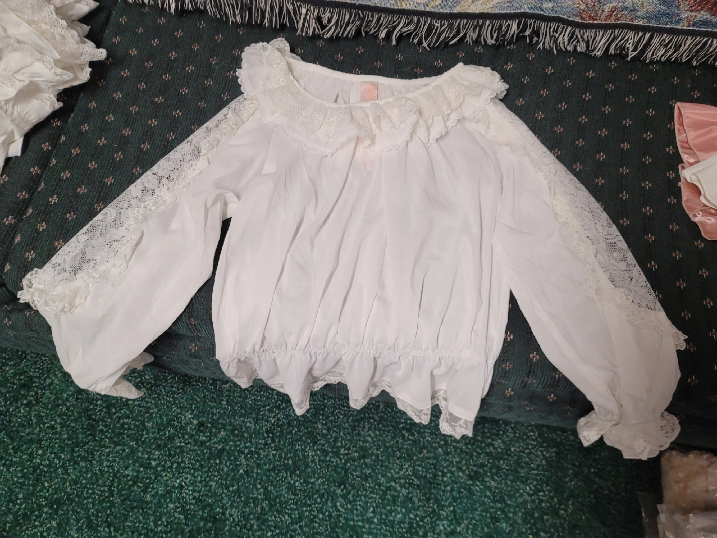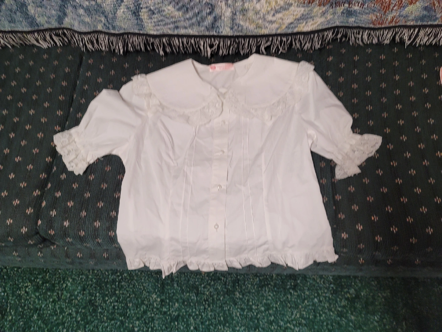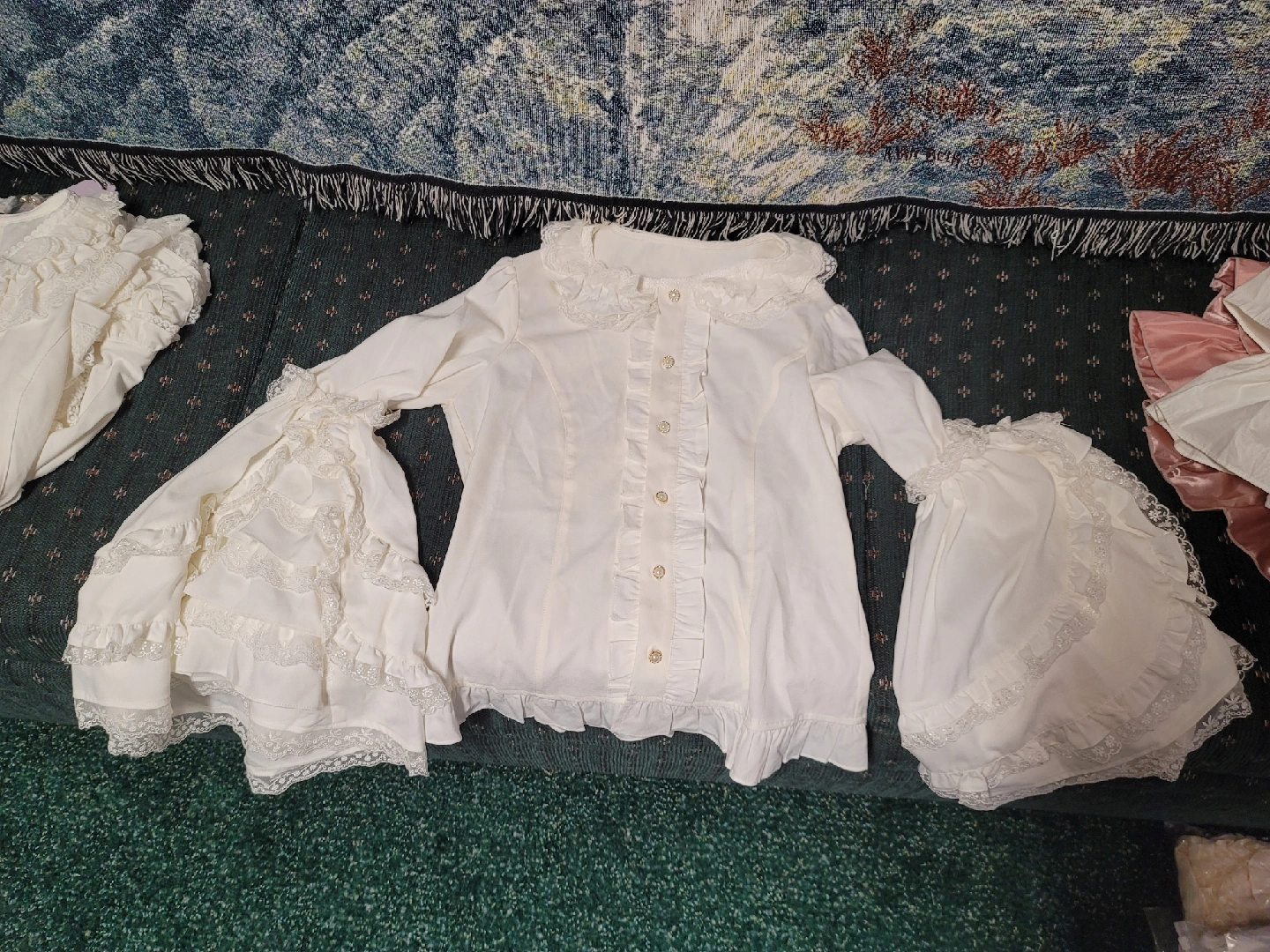 Selling a cute white Lolita style blouse! It features a ruffled collar and front, and comes with detachable sleeves for different looks. Perfect for adding a touch of sweetness to your wardrobe. Blouse w/long big, poofy sleeves = $100 Blouse w/long big, poofy sleeves + Bows = $110 Blouse w/long poofy sleeves = $80 Sleeveless Blouse = $20 Blouse w/sleeves = $30 Better Quality Blouse w/sleeves = $50 See-through Sleeves Blouse = $60 Long-Sleeve Blouse w/Bows (next to the white skirt) = $100