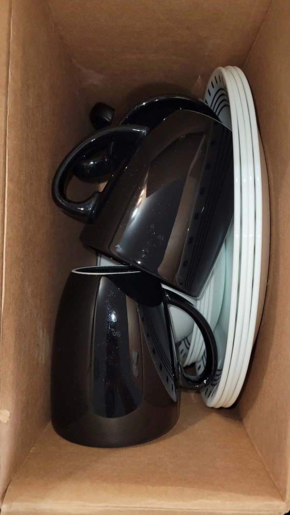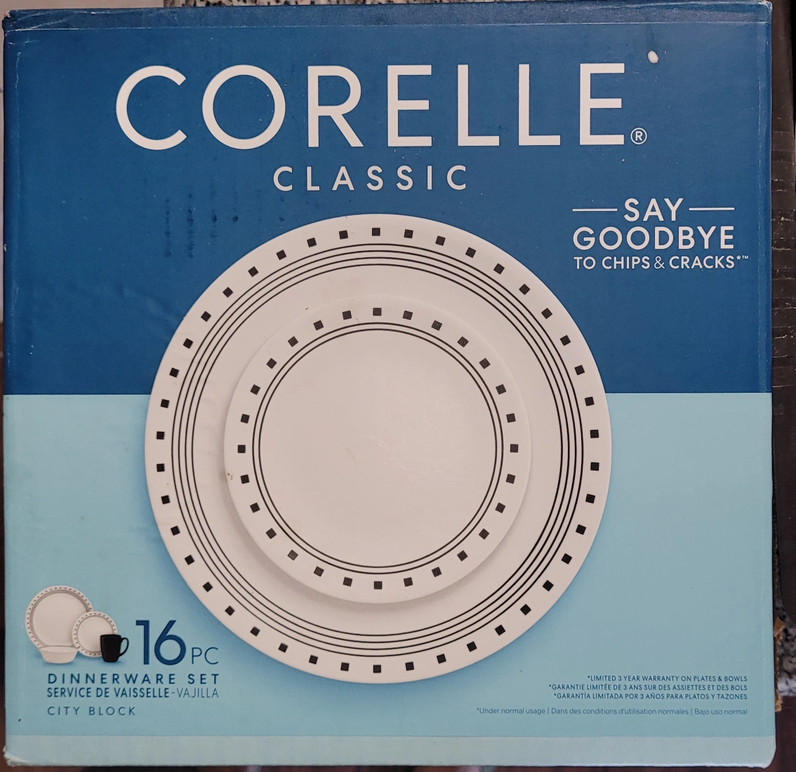 Selling a Corelle Classic City Block 16-piece dinnerware set! The set includes: - 4 dinner plates (10.25 in / 26 cm) - 4 dessert plates (6.75 in / 17.1 cm) - 4 soup/cereal bowls (18 oz / 532 mL) - 4 stoneware mugs (11 oz / 325 mL) It's lightweight and stackable, saving space in your cupboard. Plus, it's microwave and dishwasher safe! The box is included