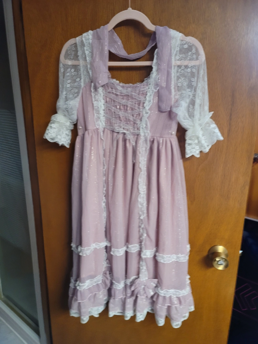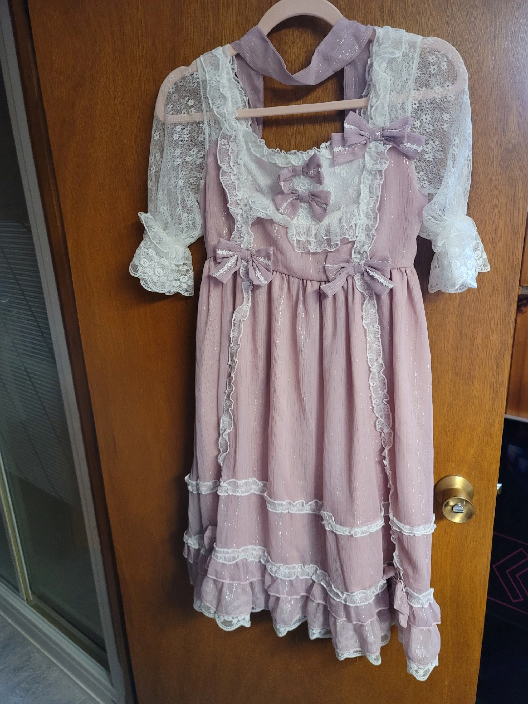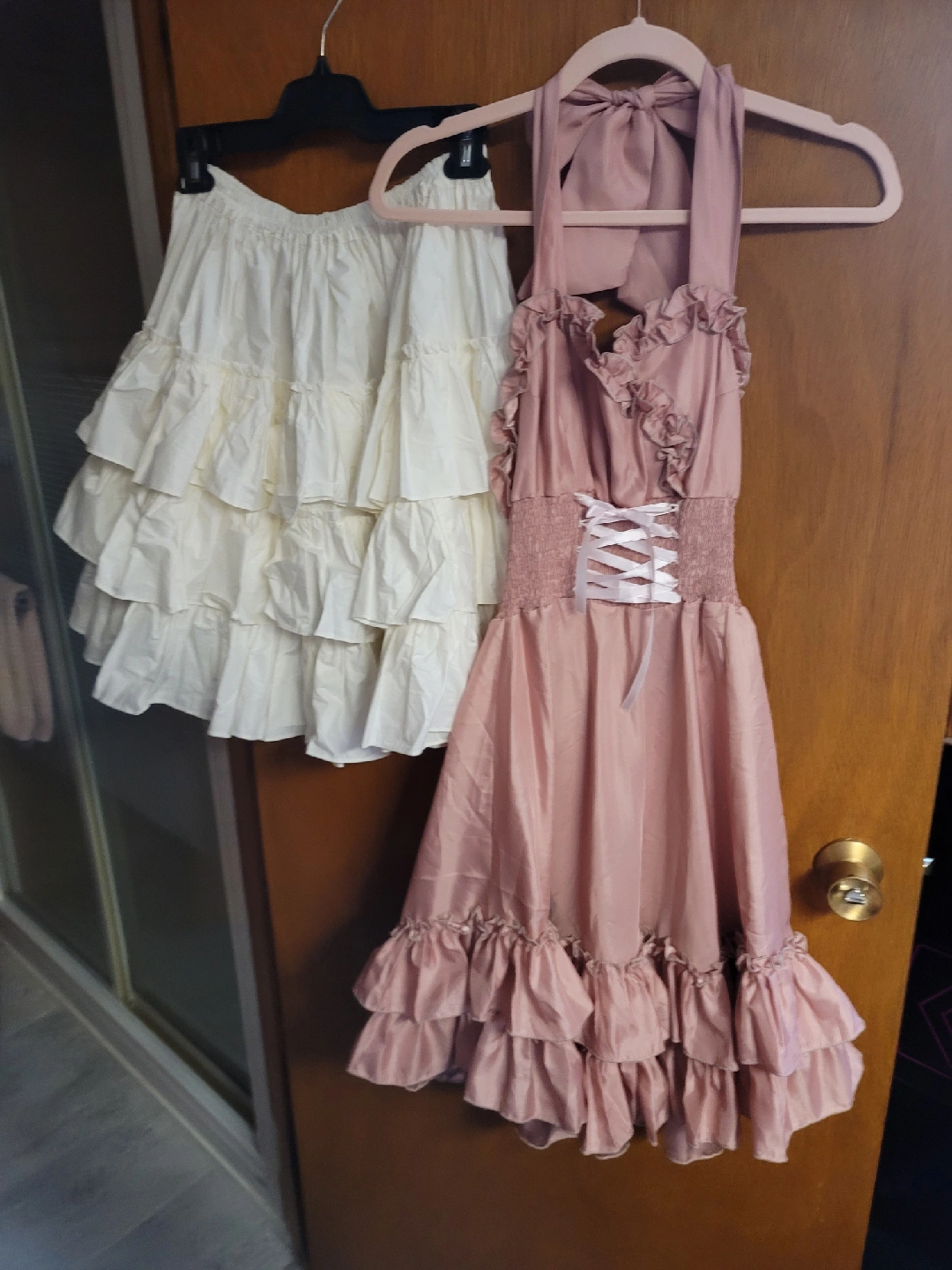 Selling a collection of lolita dresses. There's a pink dress with a bow and ruffled hem, a white ruffled skirt, a white dress with lace detailing, and a pink dress with lace sleeves and bow accents. All in great condition! 2-Piece Dress Pink = $60 2-Piece Dress Pink Shiny = $60 White Dress = $100 Pink Dress = $100
