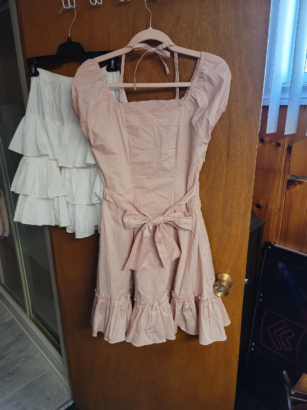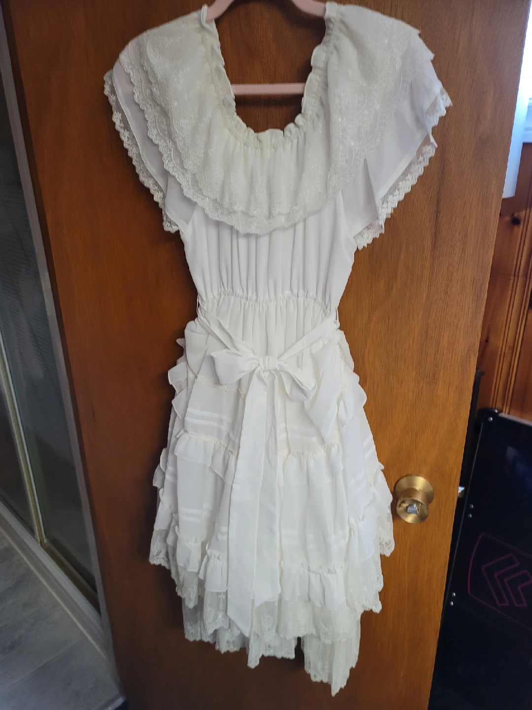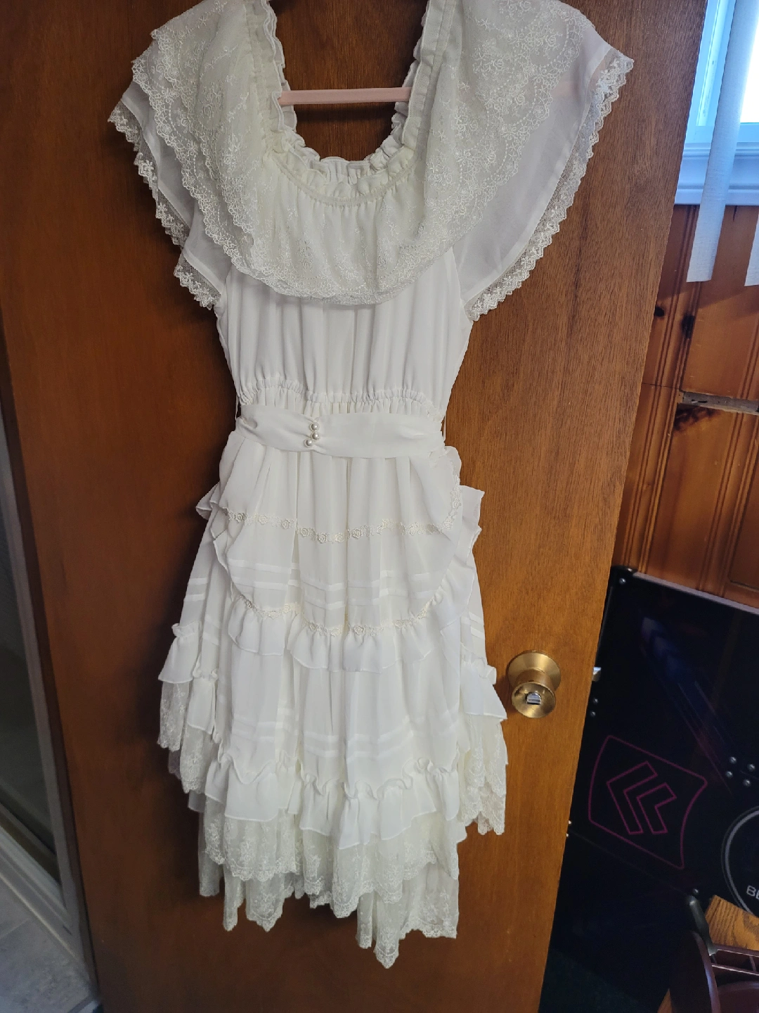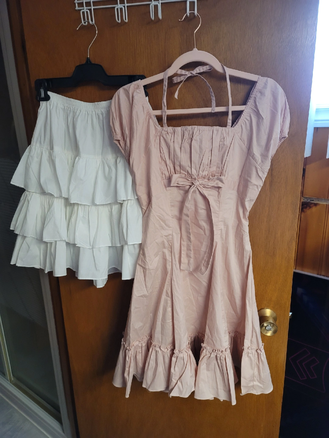 Selling a collection of lolita dresses. There's a pink dress with a bow and ruffled hem, a white ruffled skirt, a white dress with lace detailing, and a pink dress with lace sleeves and bow accents. All in great condition! 2-Piece Dress Pink = $60 2-Piece Dress Pink Shiny = $60 White Dress = $100 Pink Dress = $100