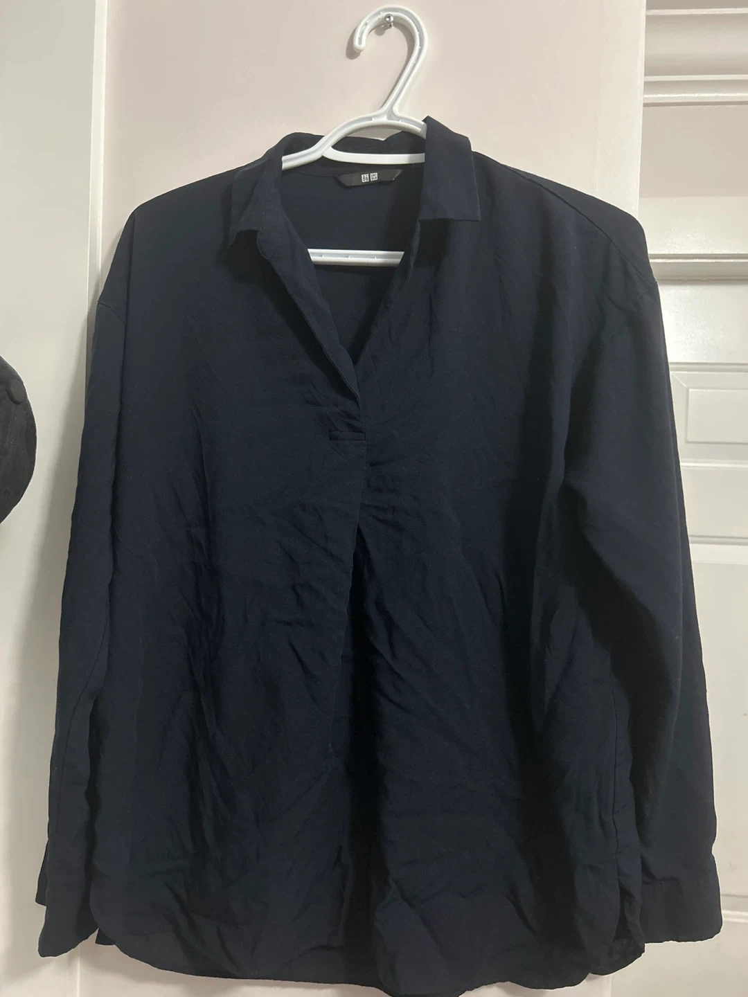 Selling a Uniqlo long-sleeve blouse in a dark navy colour. It's in great condition and perfect for layering or wearing on its own. The material is lightweight and comfortable!