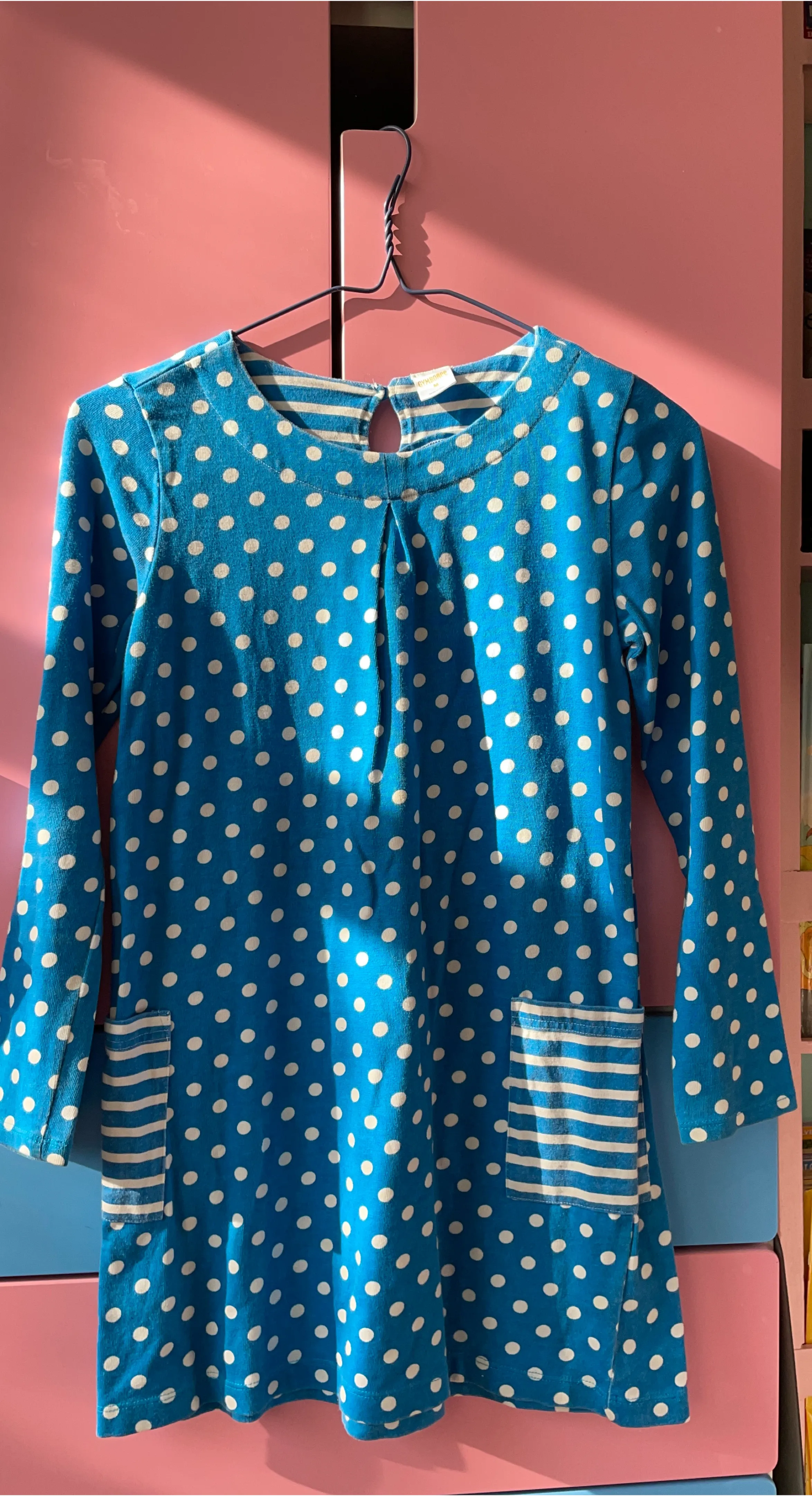 This adorable Gymboree dress features a fun blue polka dot pattern with cute striped pockets! It's in great condition and perfect for your little one. Size is M.