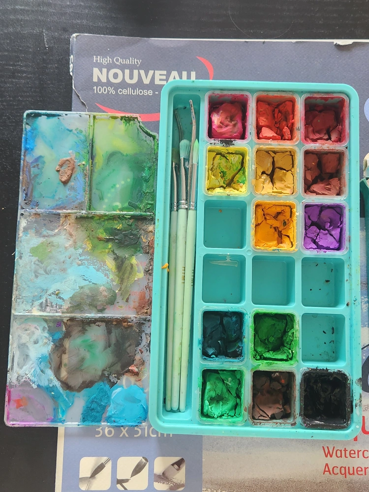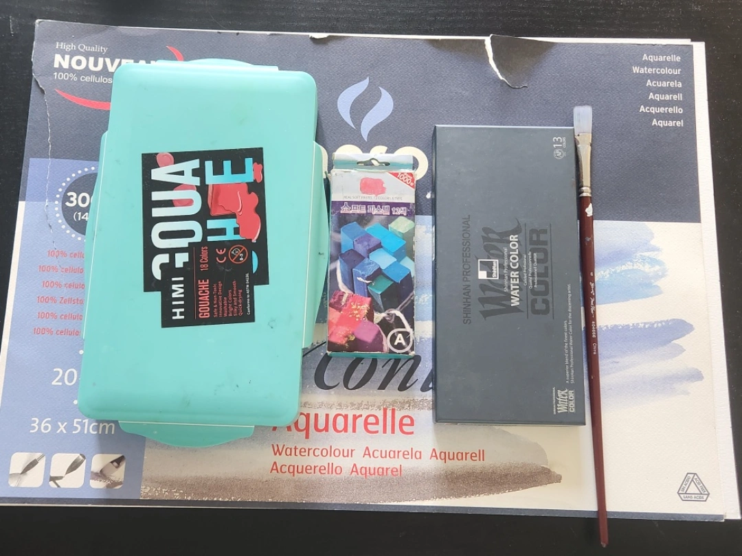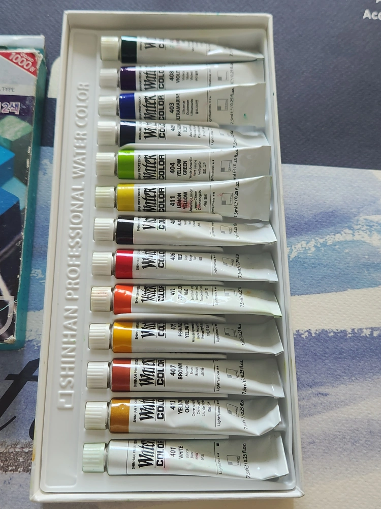 Selling a ShinHan Professional Water Color set. This set includes a variety of vibrant colours, perfect for any artist looking to expand their palette. The tubes are 7.5ml or 0.25 fl oz each. Also included is a set of soft pastels. An artificual fur paintbrush and canson watercolour 300g, size 36 × 51cm paper at the back. Take all for $5