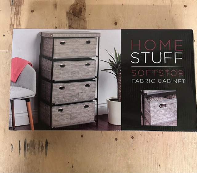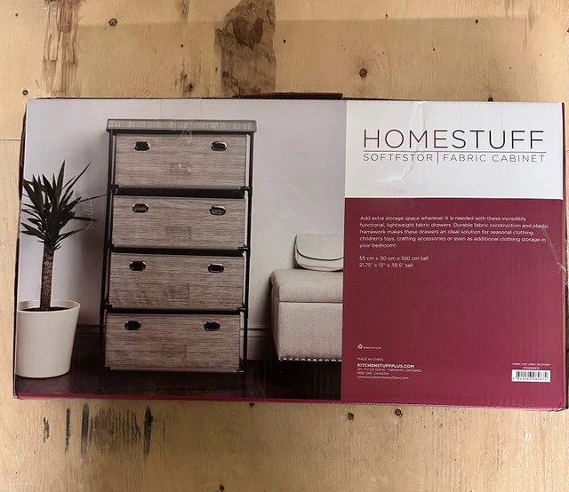 This brand new HOMESTUFF fabric storage cabinet features a four-drawer design, perfect for organizing any room. With its sturdy construction and stylish appearance, this unit offers both functionality and aesthetic appeal, making it an excellent addition to your home storage solutions. The cabinet is still in its original packaging. Specifications: * Brand: HOMESTUFF * Type: Fabric Storage Cabinet * Drawers: 4 * Condition: Brand New