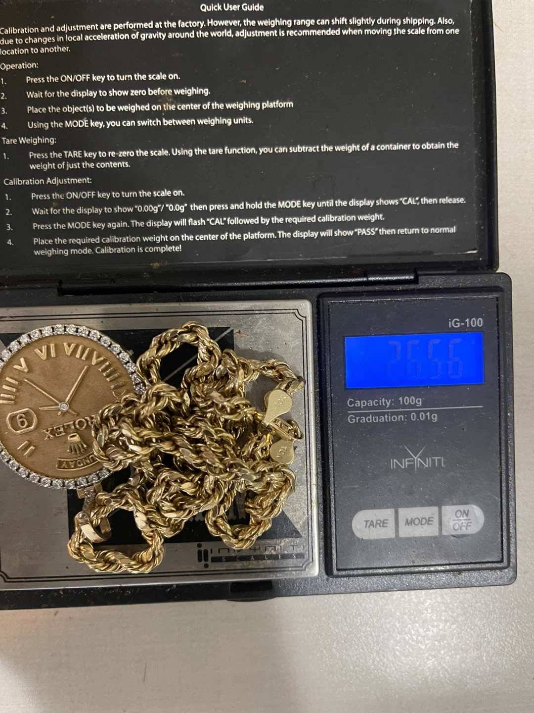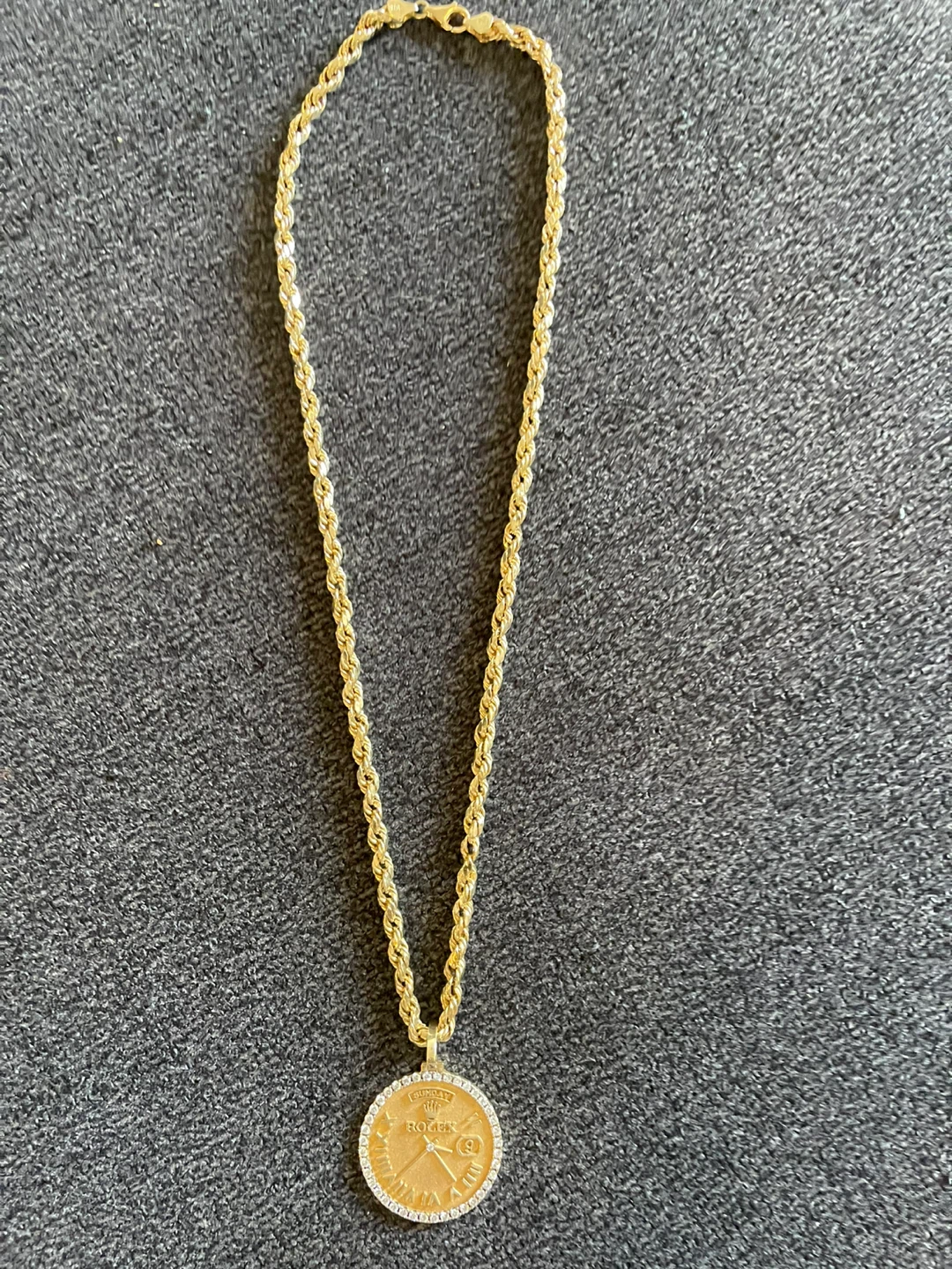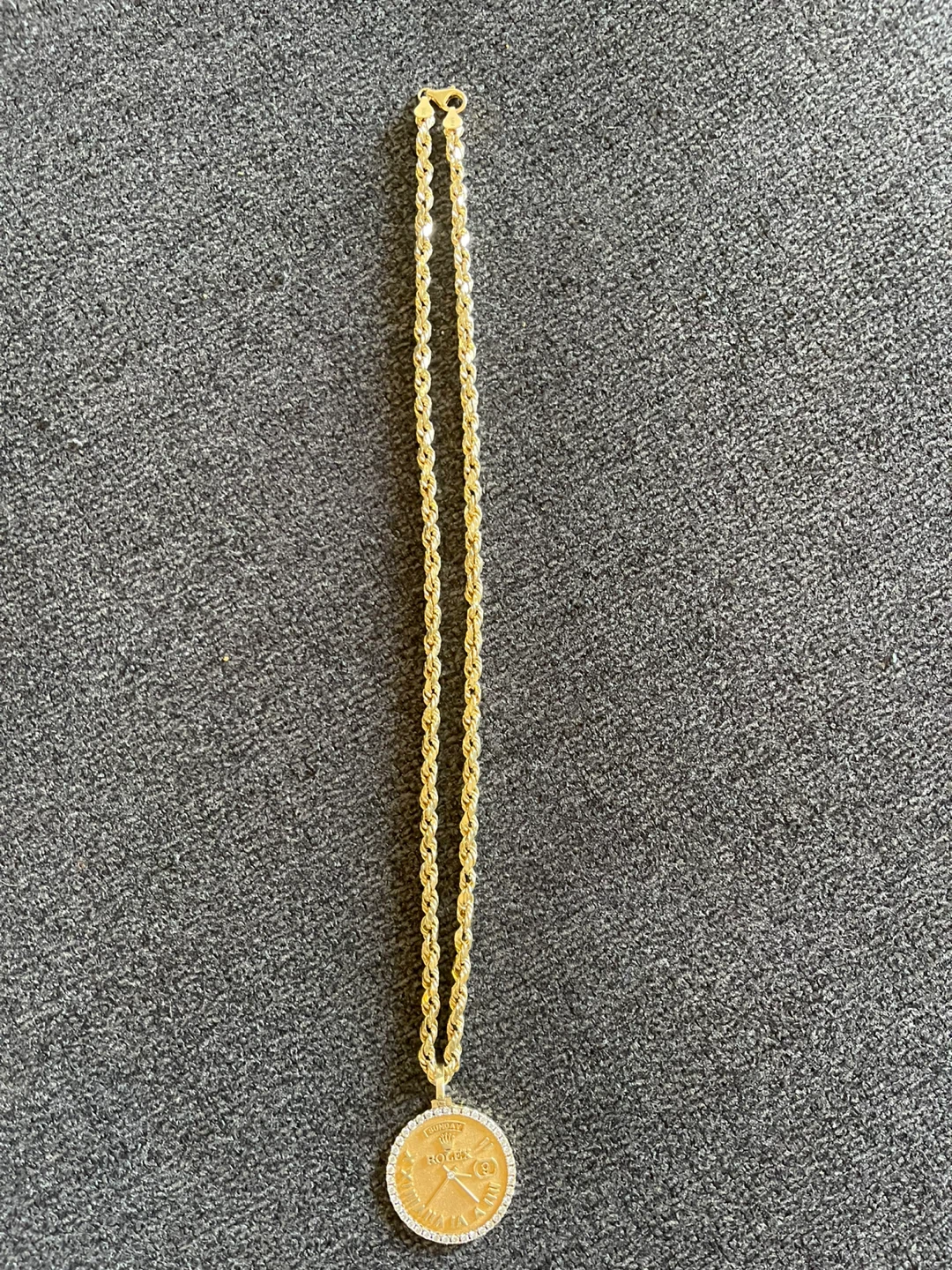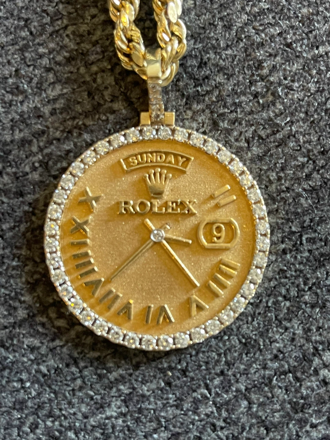 Selling a gold Rolex pendant necklace 10k. The pendant features a "Sunday" Rolex design with natural diamonds accents around the edge. The chain is a matching gold colour. Chain and pendant weights 26.56 grams diamonds 2.75ct