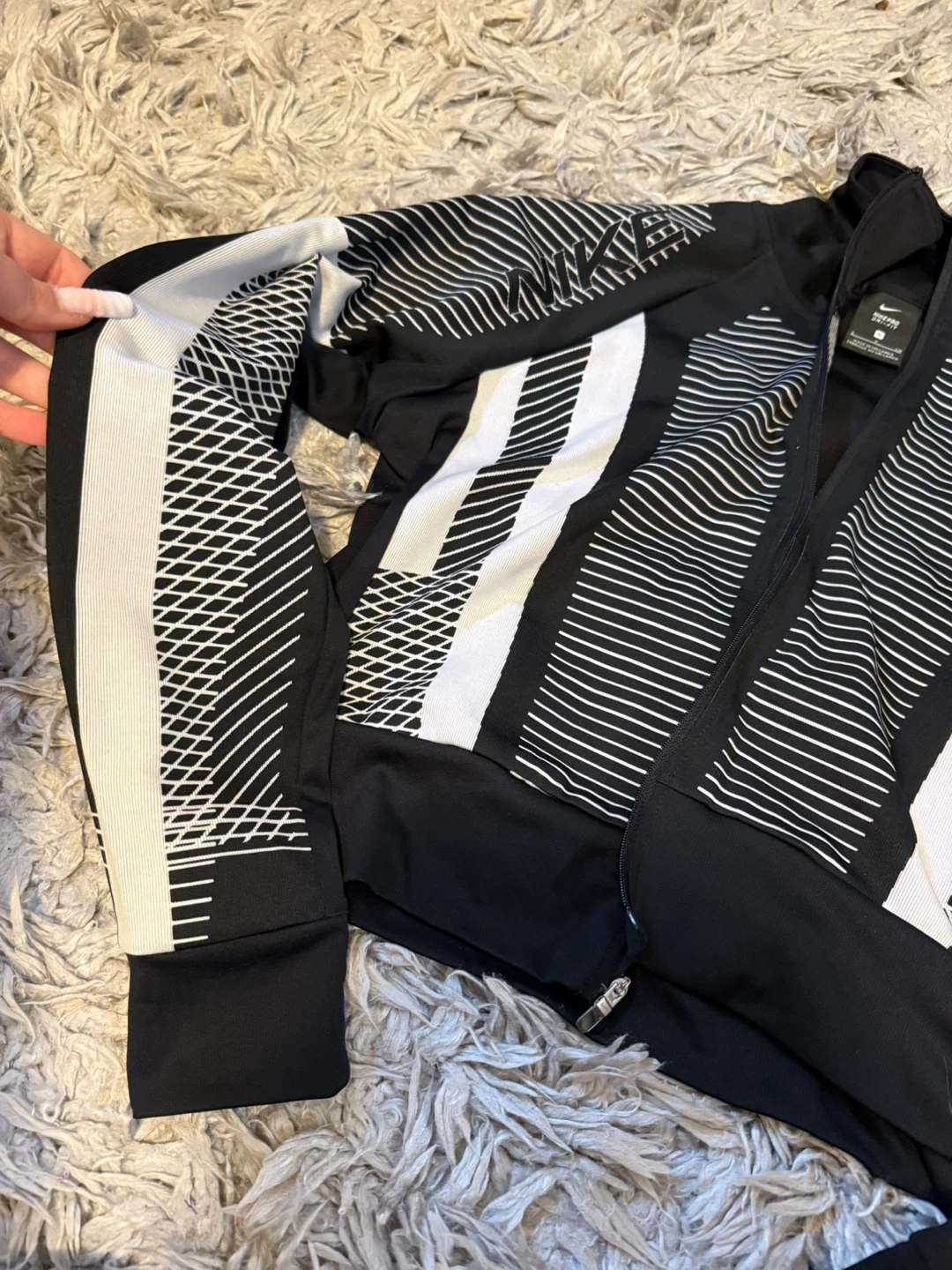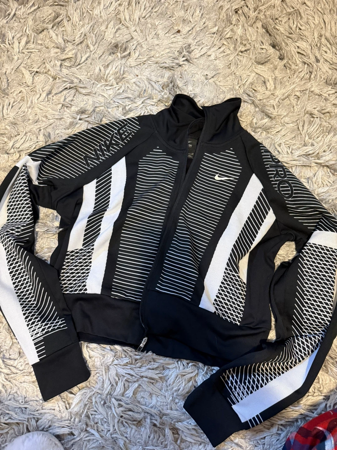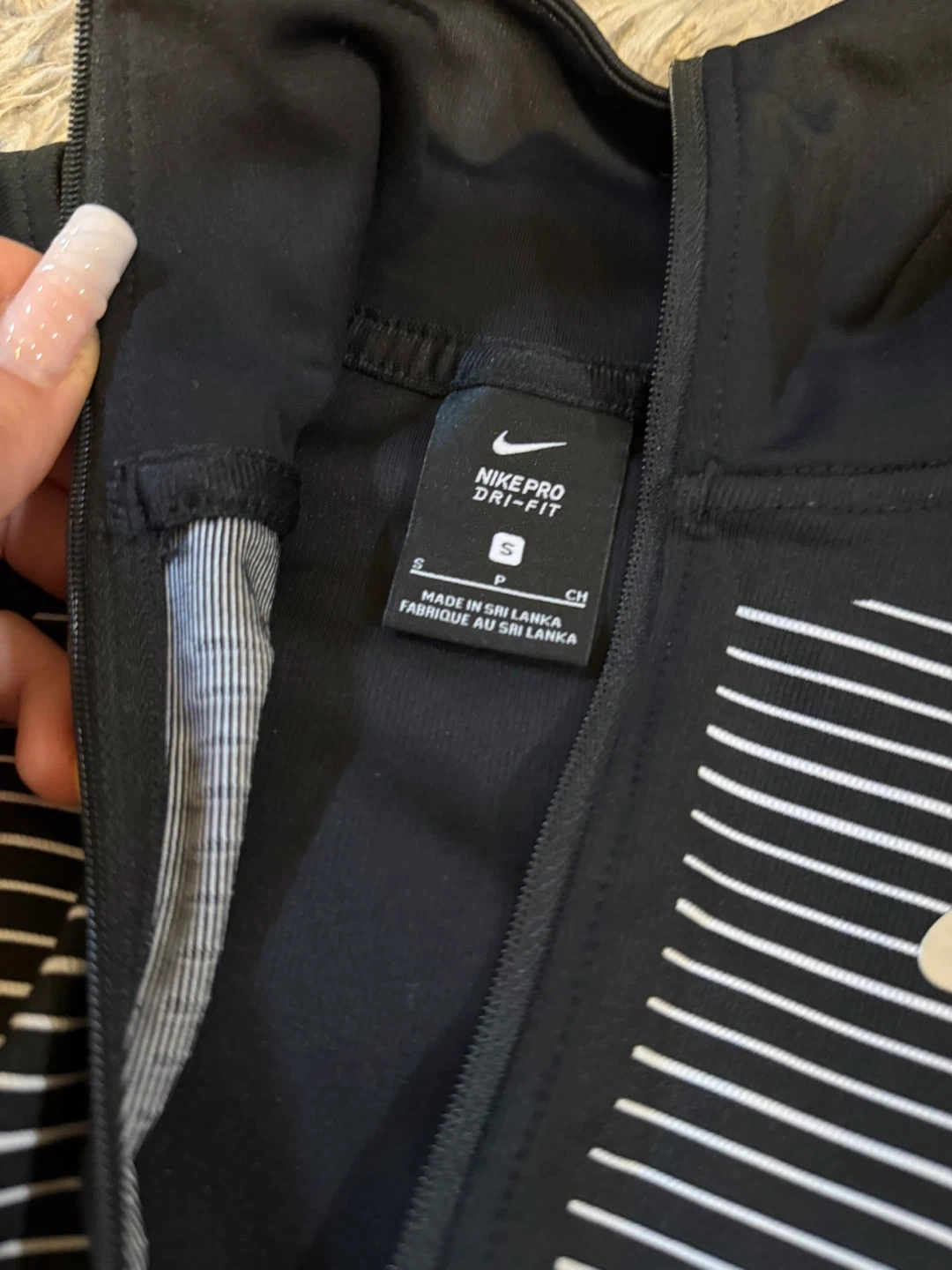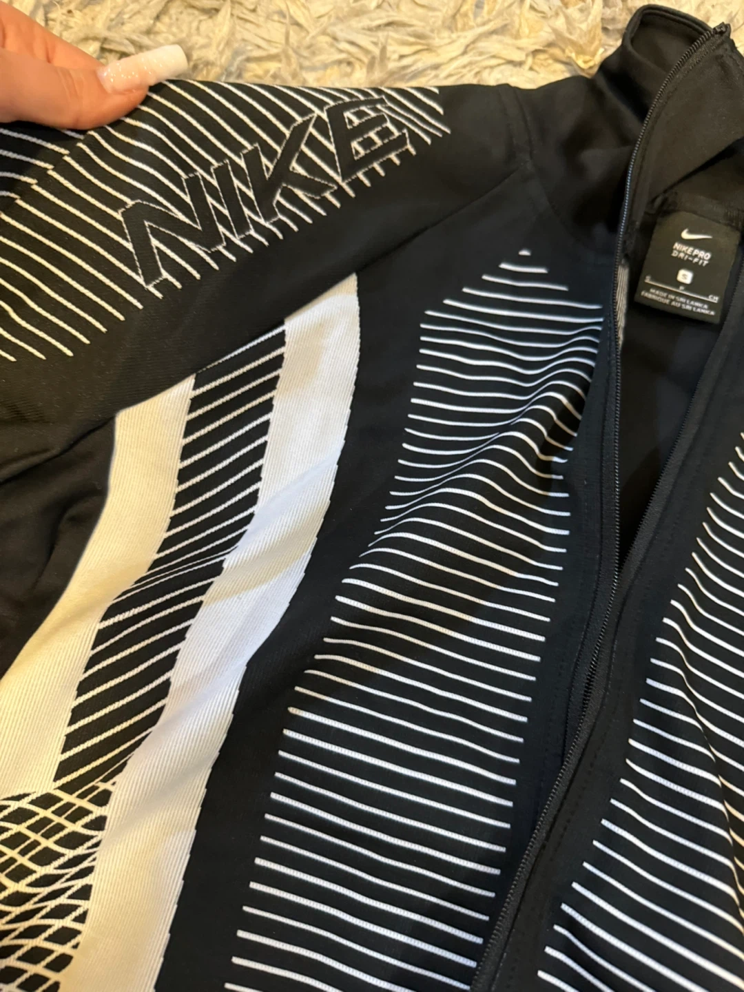 Selling a Nike Pro Dri-FIT jacket in size small. It's black with a cool white striped design. Perfect for workouts or just everyday wear!