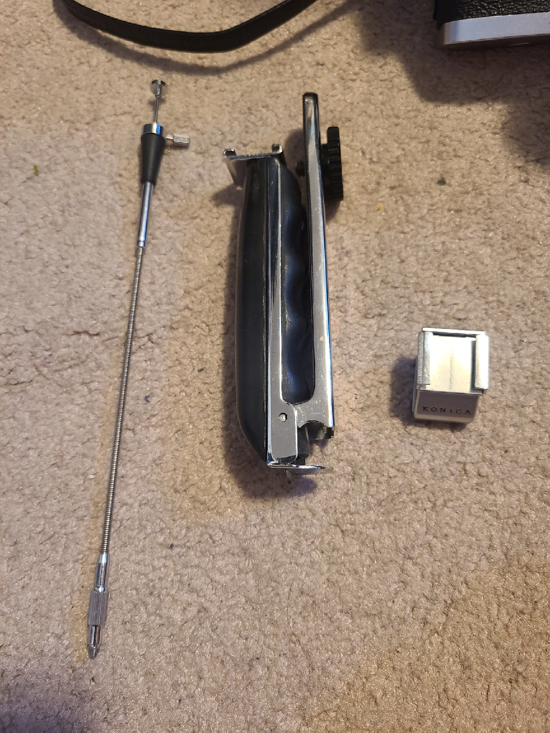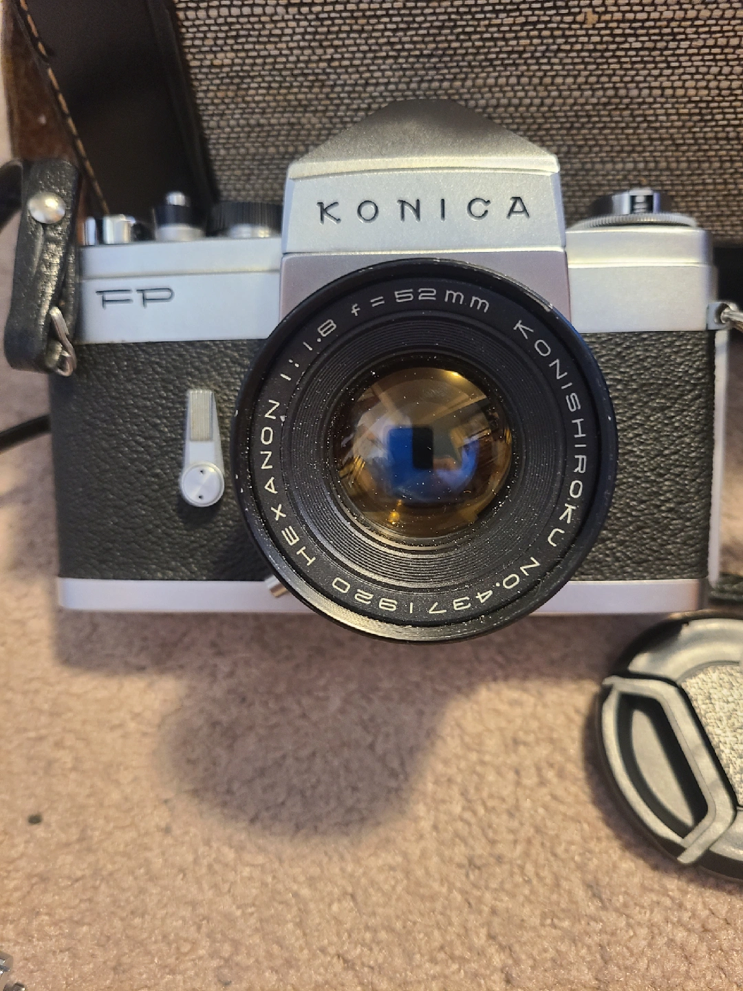 Selling a vintage Konica FP 35mm film camera. It comes with a Hexanon 1:1.8 lens, a Soligor1:3.5 lens, shoe mount adapter, flash extension, GE external light meter, shooter release cable, and vintage carrying bag.