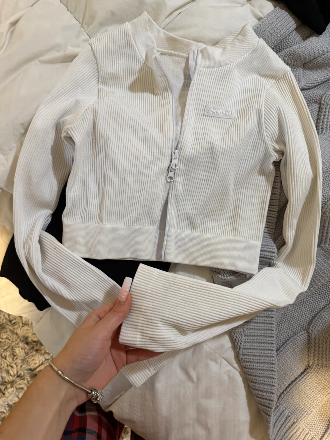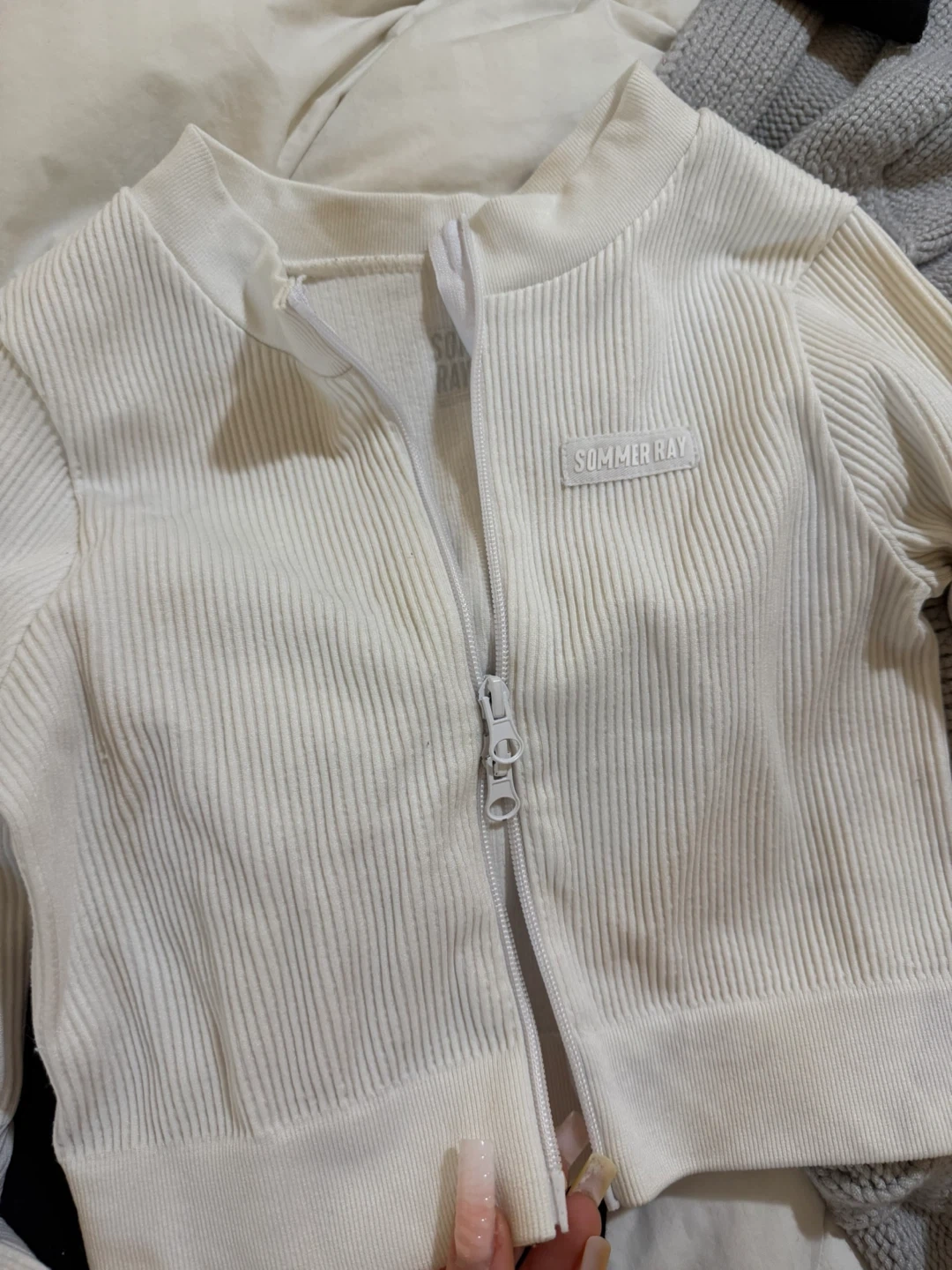 Sommer Ray White Ribbed Cropped Zip Jacket