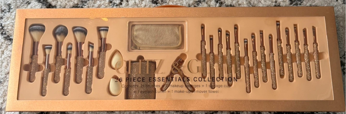 GLITZ & GLAM 26 Piece Essentials Collection makeup brush set! The set includes 21 brushes, 2 makeup sponges, 1 storage cup, 1 eyelash curler, and 1 makeup remover towel