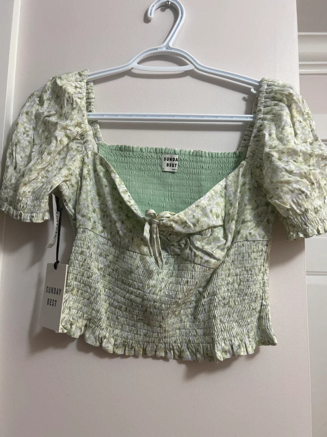 29This is a Sunday Best Sinatra top in size M. It features a jam-packed sage floral design and a smocked bodice. Perfect for spring!