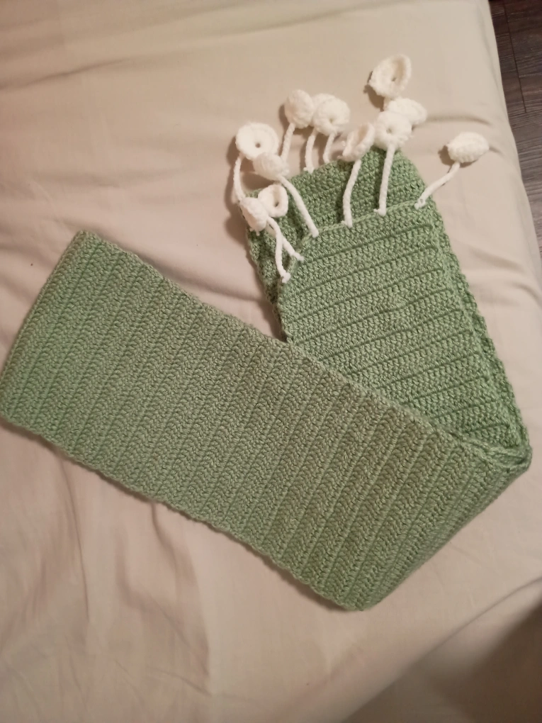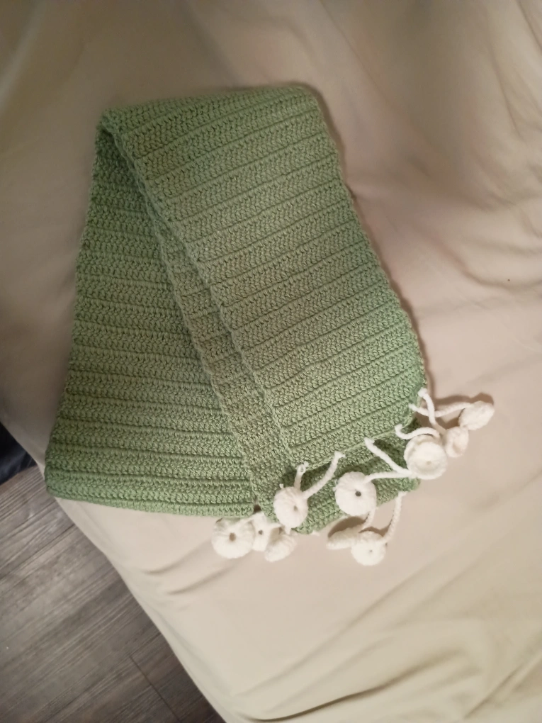 Selling a cozy, handmade crochet scarf in a lovely green colour. It's got some cute white accents. Perfect for keeping warm on chilly days!