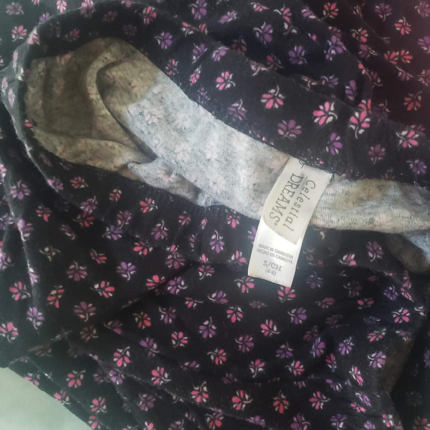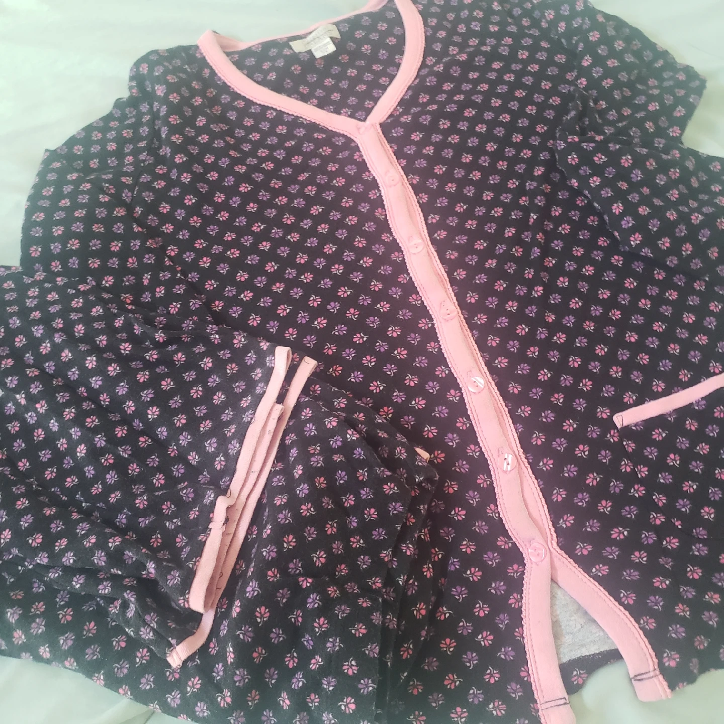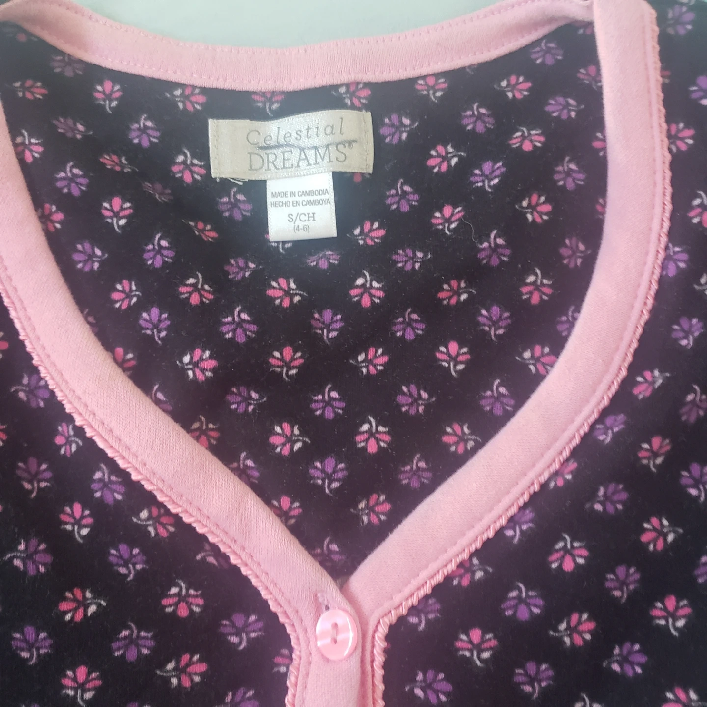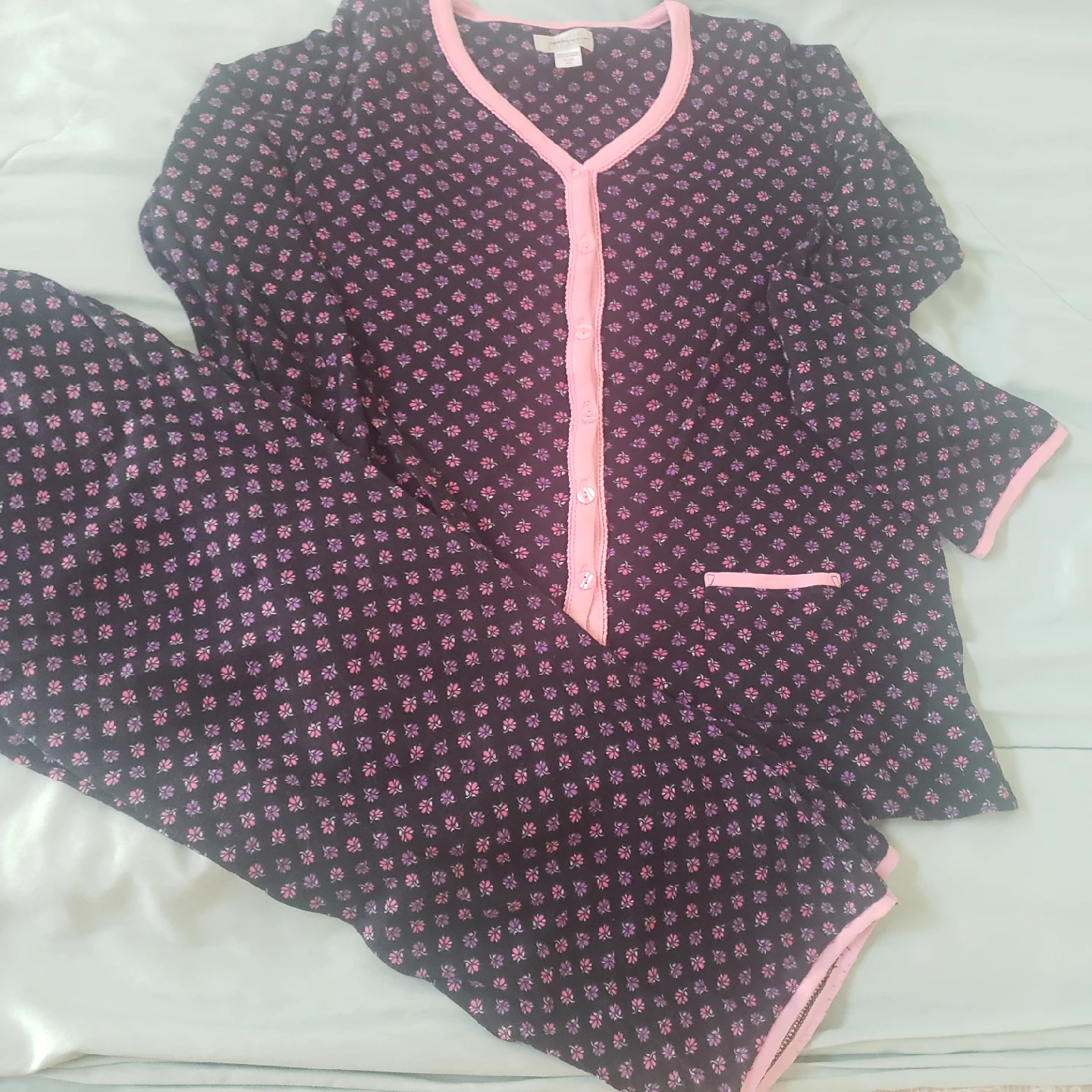 Cute Celestial Dreams pajama set in size small! The set is made of 100% cotton. It has a black background with a pink floral print and pink trim. Super comfy for lounging around the house!