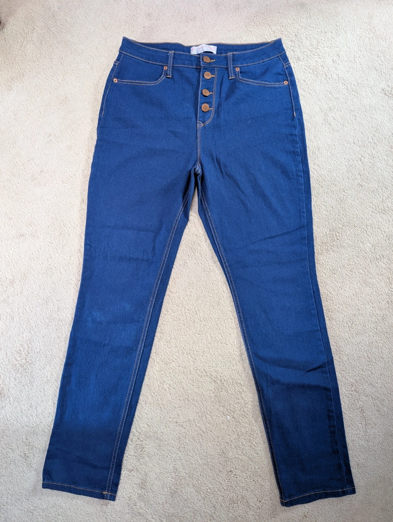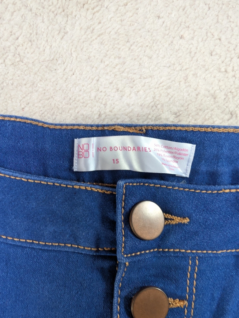 Selling a pair of No Boundaries jeans in a lovely blue colour! They are a size 15 and made of 54% cotton, 26% recycled polyester, 19% rayon, and 1% spandex, making them super comfy and a bit stretchy Porch Pick up Ajax Church and Delaney Please see My profile for more items