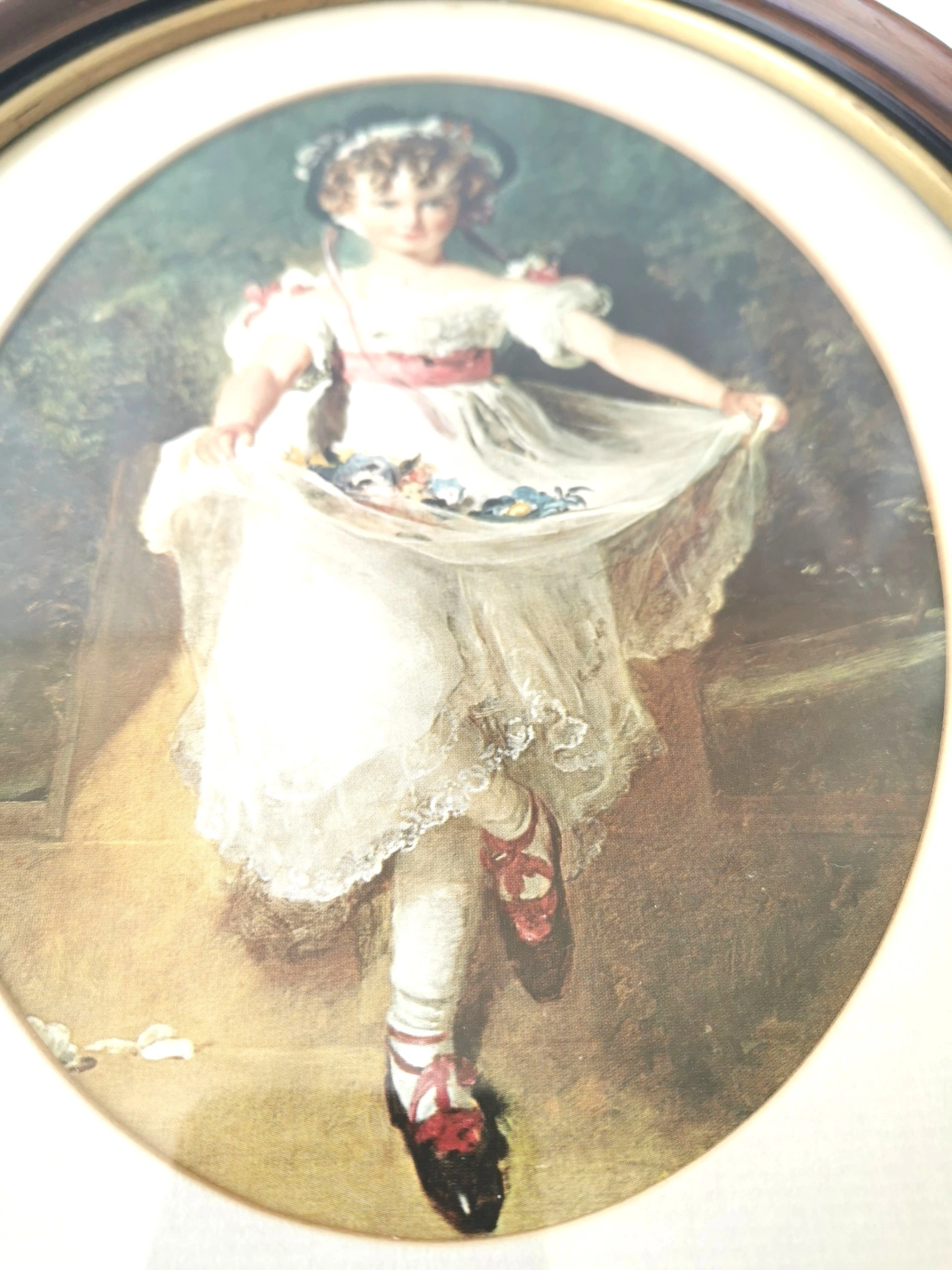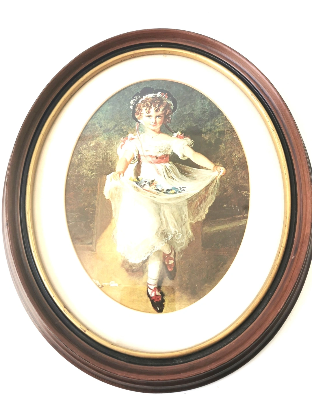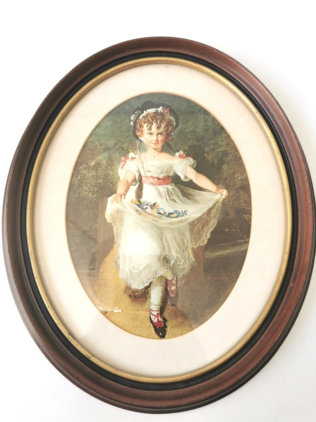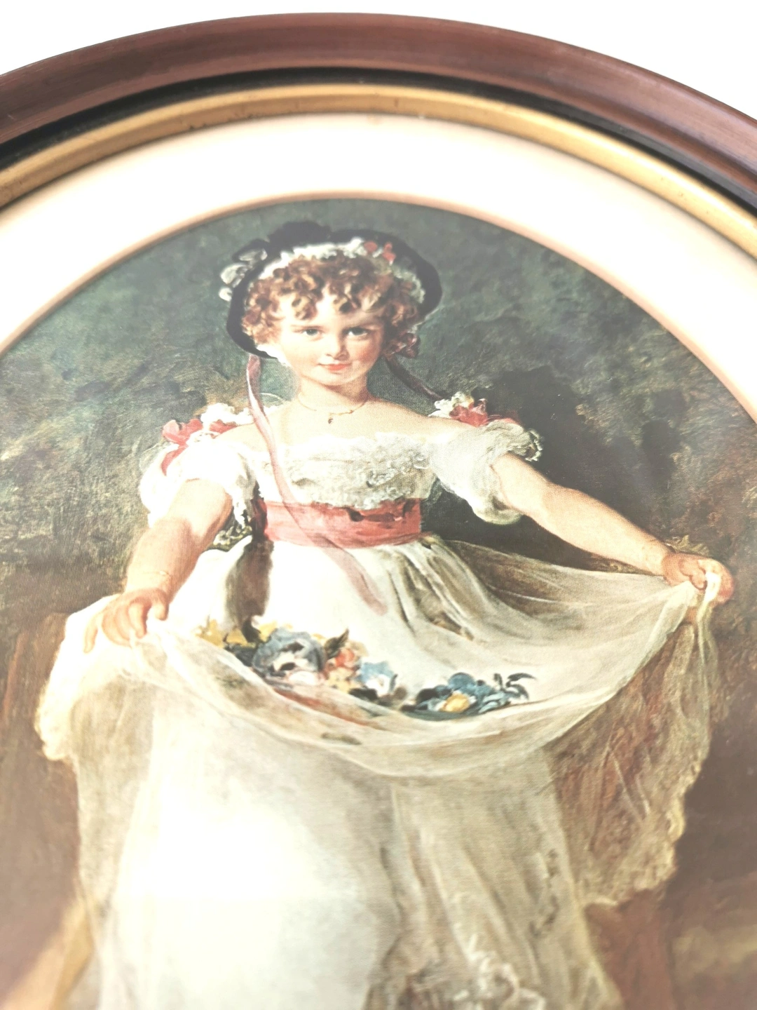 Medium-sized print by Sir Thomas Lawrence, featuring a portrait titled "Louisa Georgina Augusta Anne Murray Vintage." The artwork depicts the child in a classic style, with influences from Italy. Beautiful brown hard wood frame. Dimensions- Height 10.75 inches, Width 9 inches, Depth 1 inch Good vintage condition light wear blemish on rear paper covering pleae reference photos as part of the description.