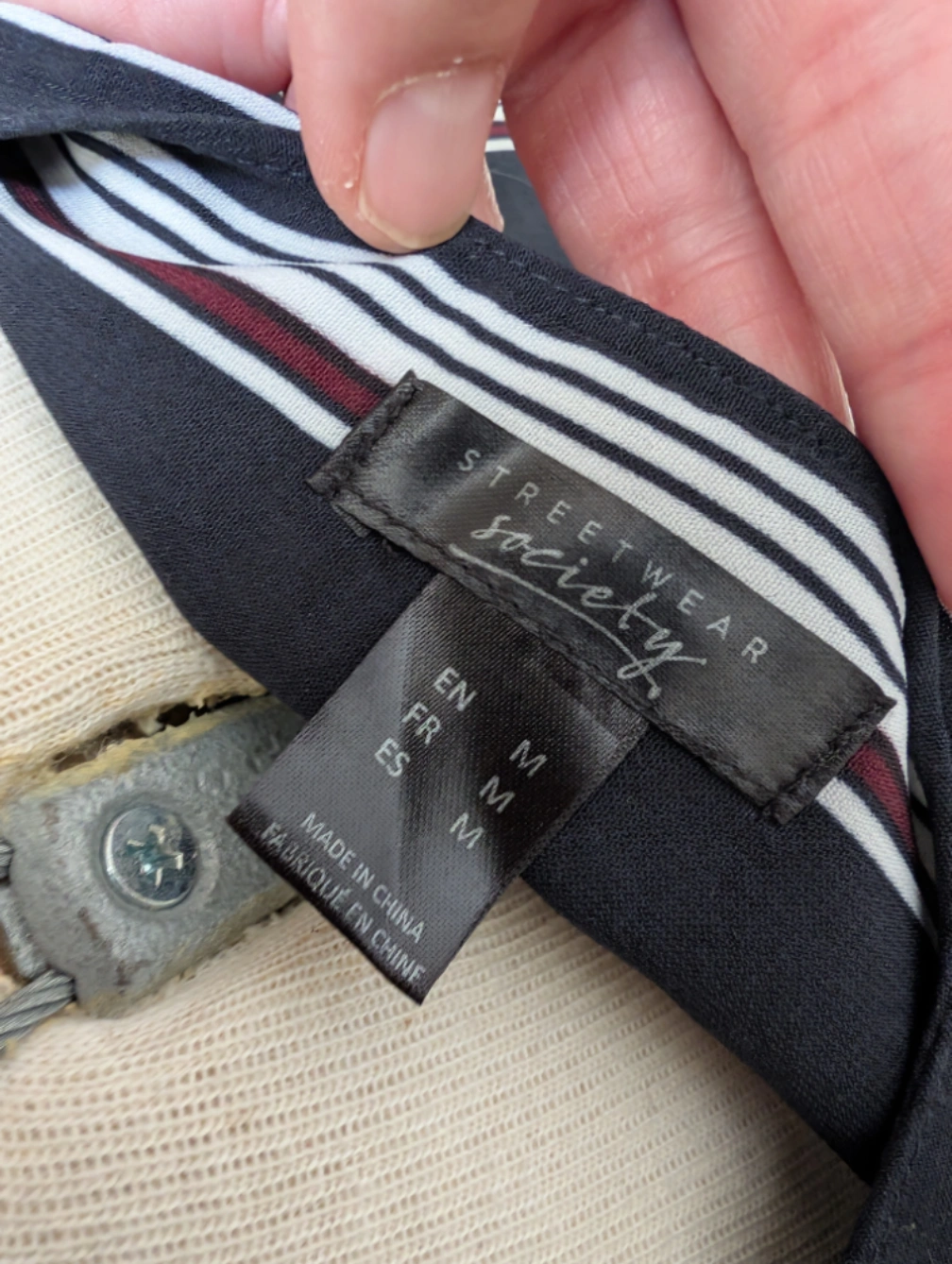 Here's a cute dress from Streetwear Society! It features a striped pattern in navy, white, and burgundy. It's a size medium and made in China Porch Pick up Ajax Church and Delaney Please see My profile for more items