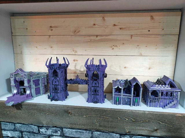 Dive into your D&D campaigns with this striking set of Drow building terrain, perfect for creating immersive and detailed environments for your miniatures. This terrain set includes a variety of pieces, all hand painted. These buildings come apart in different floors so the adventure can continue inside as well! Drow miniatures included if you buy the other half of this ad. Imagine your heroes navigating the treacherous underdark with this unique terrain, bringing your tabletop to life! If the ad's still up, the terrain's ready to go on an adventure with you!