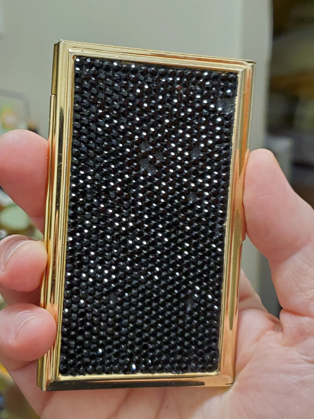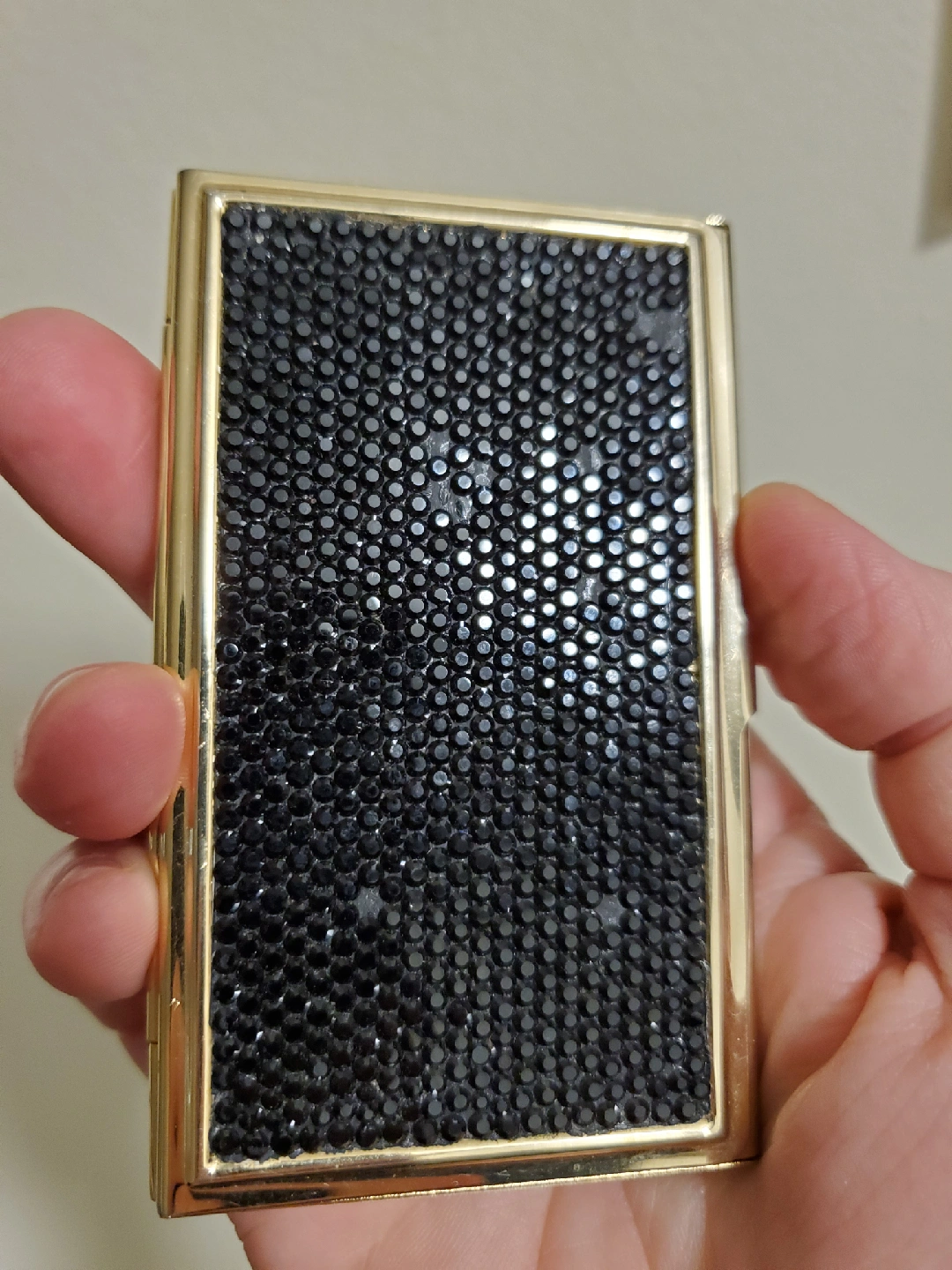 Selling a Judith Leiber business card holder. It's gold with black rhinestones. It's in decent condition with some signs of wear on the back and is missing some rhinestones.