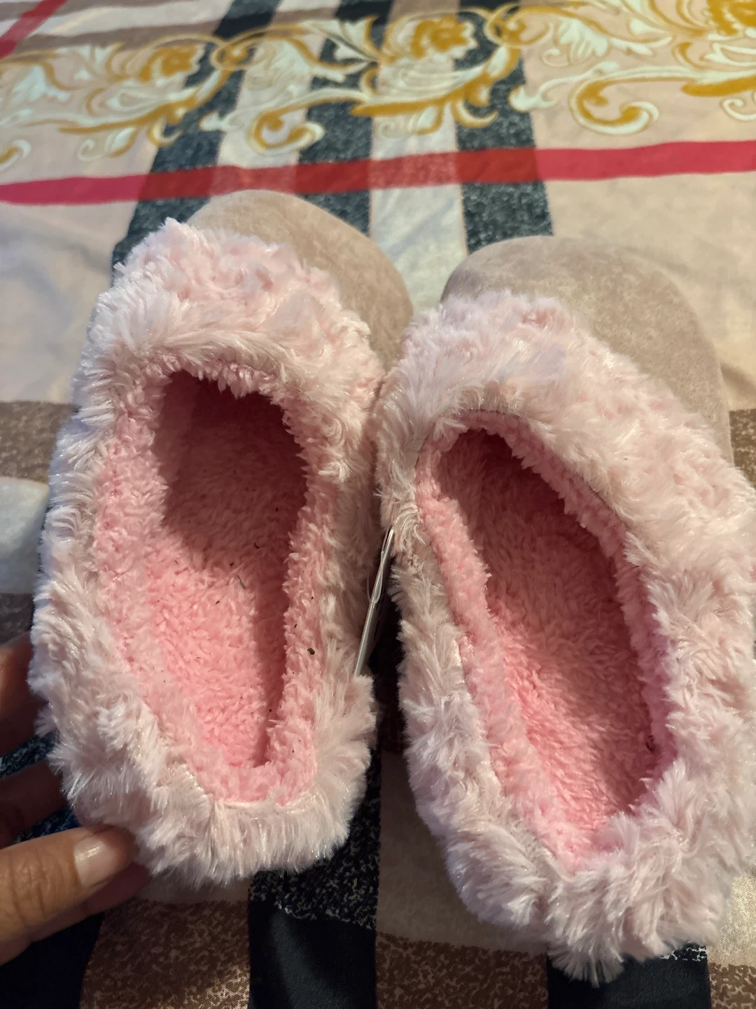 Selling a pair of ONCAI women's slippers, size US 7. These slippers are super cozy and perfect for wearing around the house. They have a soft, fuzzy interior and a striped sole for grip