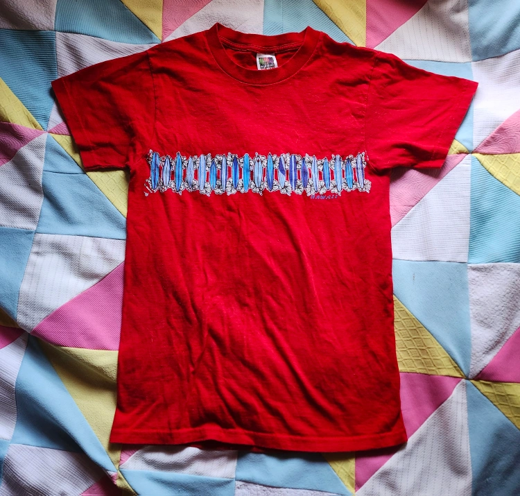 75Red and blue vintage 2000s Hawaii surfboard graphic tshirt adorable Hawaii souvenir shirt, printed on a heavy cotton Fruit of the Loom shirt. the floral/surfboard pattern is so iconic and cute. it has a little bit of cracking due to age but is in solid condition label size S, pit to pit laying flat is just under 17.5in, and length from shoulder to bottom is just over 26in item is in good vintage condition. the tshirt itself its is great shape. the print has some cracking (pic 3) please keep this in mind while buying!