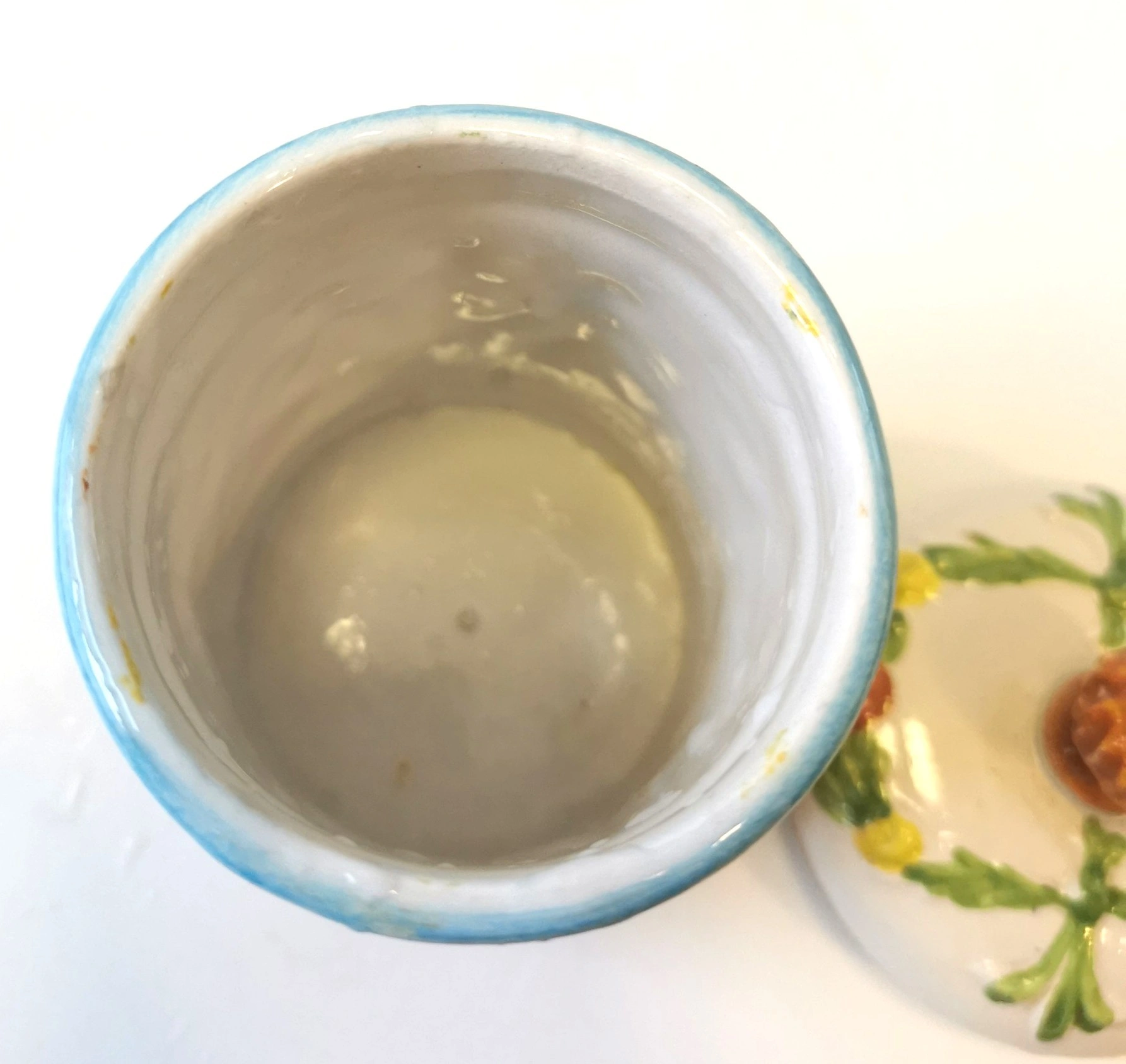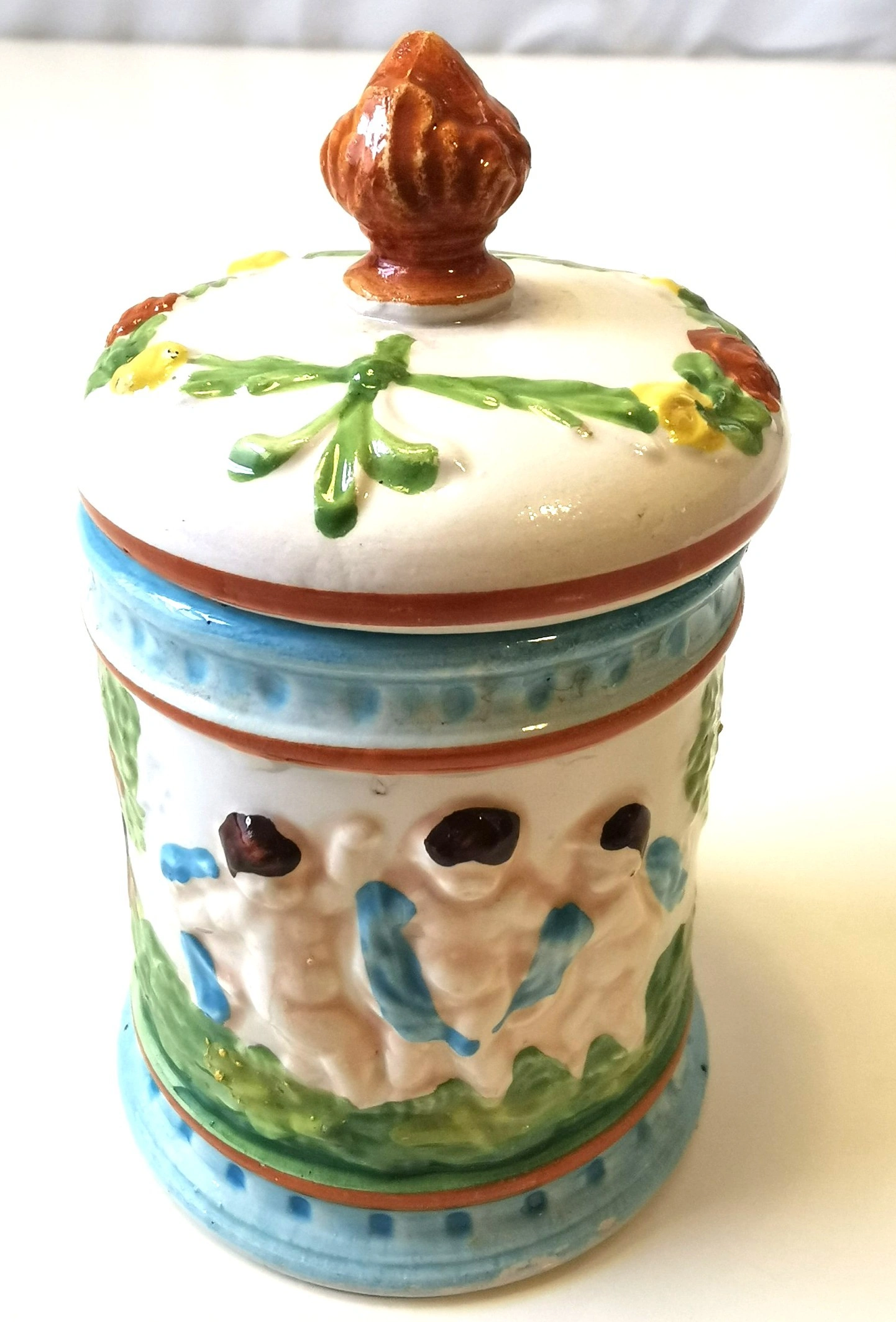 Description Crafted with meticulous attention to detail, this small porcelain figurine is a charming display piece that embodies the fine artistry of Italian craftsmanship. Its multicolored palette and all-over pattern showcase a blend of vibrant hues that bring a touch of color to any room or collection. The figurine, unbranded yet distinctly Italian in its design and manufacture, stands as a testament to the timeless appeal of handcrafted porcelain. Whether adorning a mantle or enhancing a curio cabinet, this delightful piece is sure to captivate and add a hint of sophistication to your space. Height 4 inches, Diameter 2.5 inches Good vintage condition light wear, please reference photos as part of the description