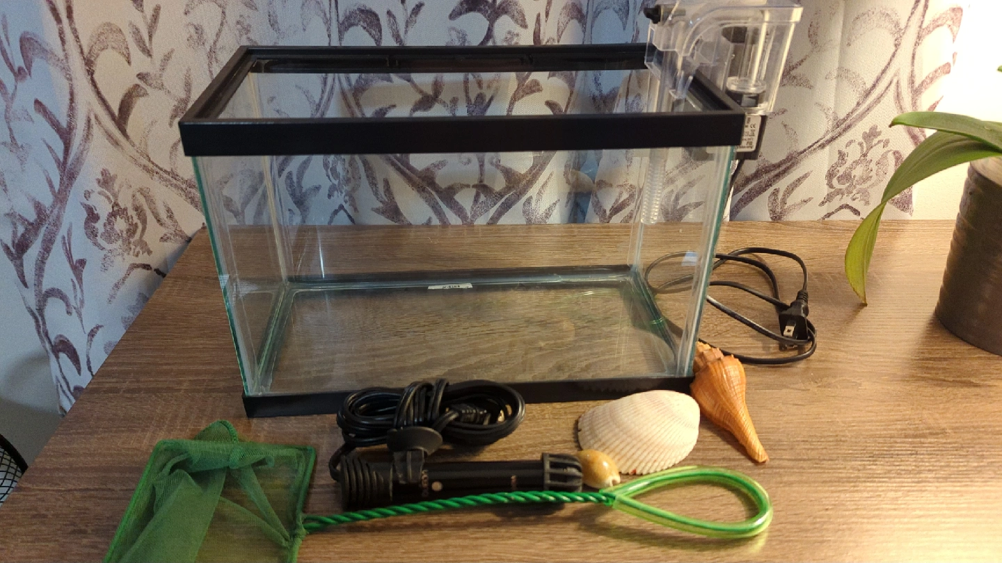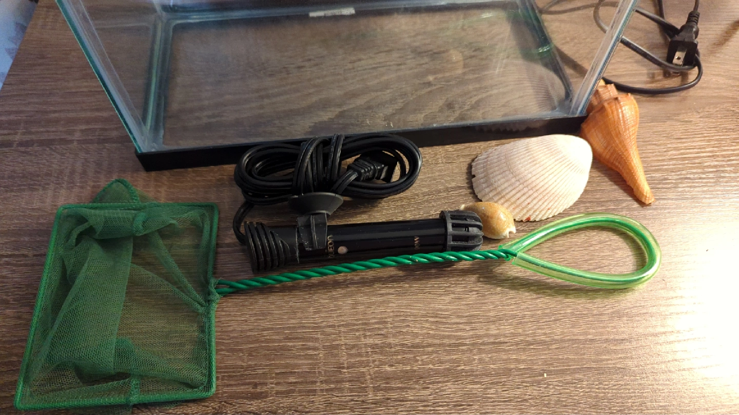 Selling a used aquarium tank that comes with various accessories to get you started! Included is a filter, heater, net, and some decorative shells. It's a great setup for a small aquarium and is ready to go!