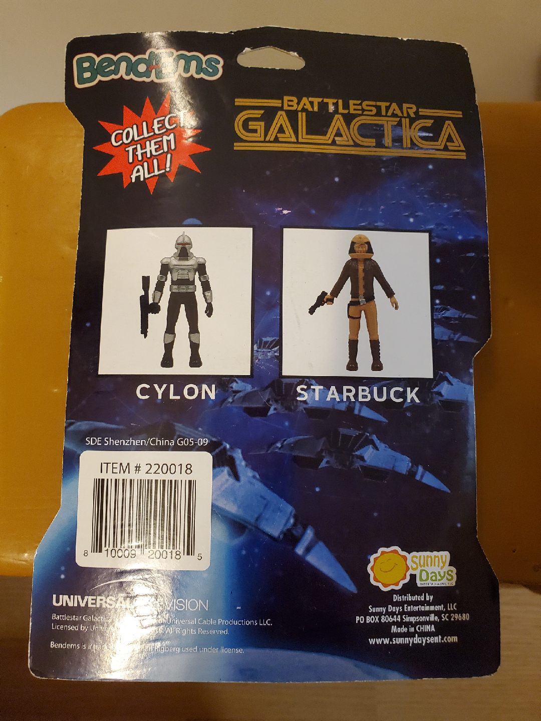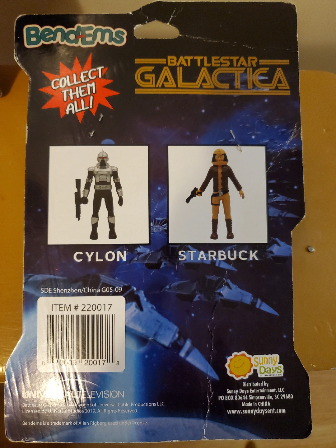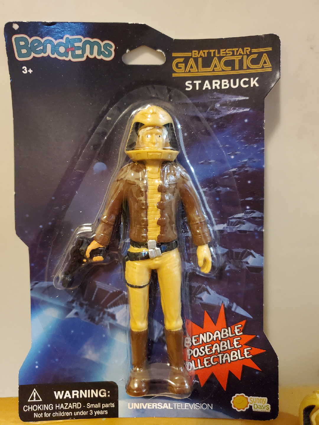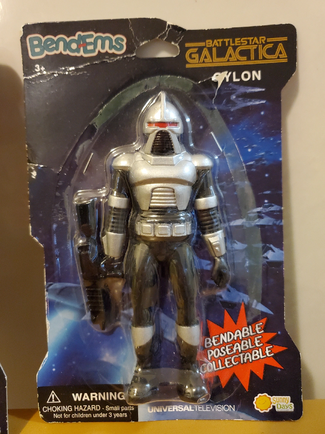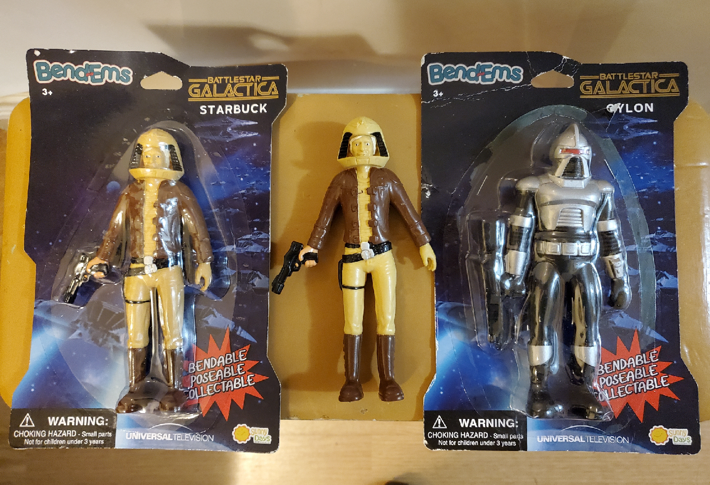 Selling 3 Battlestar Galactica BendEms figures. Two are Starbuck, and the other is a Cylon. They are bendable and poseable collectibles. Suitable for ages 3+
