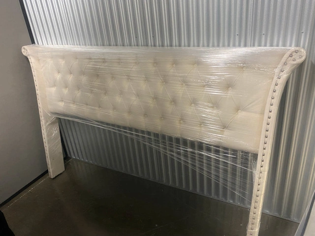 10Add a touch of elegance to your bedroom with this king-sized bed frame, featuring button-tufted upholstery and nailhead trim. This headboard is nearly new, having seen very little use and is in excellent condition. Ready to transform your sleeping space. Includes pillow top mattress and box spring * Size: king * Upholstery: Button-tufted * Trim: Nailhead Pick-up at Dymon storage in Whitby