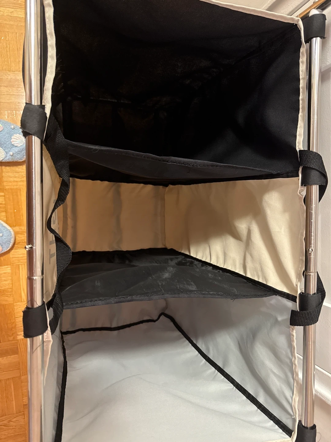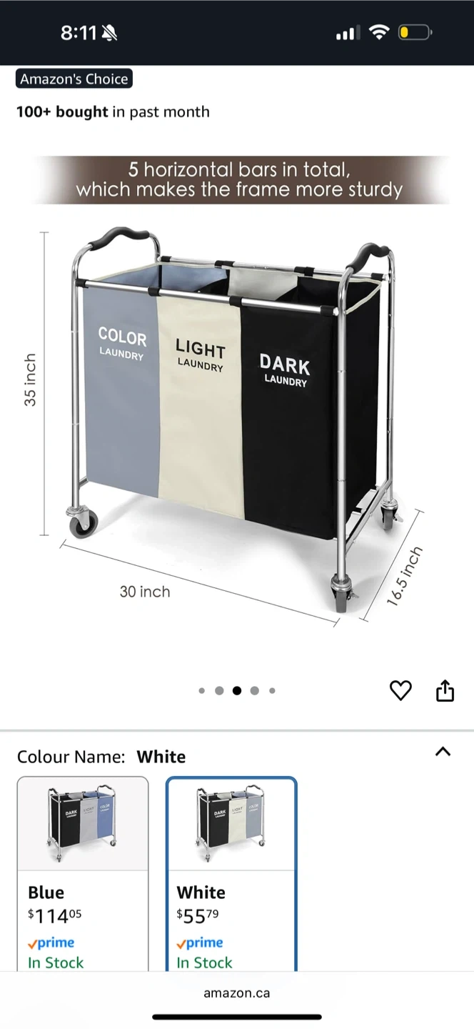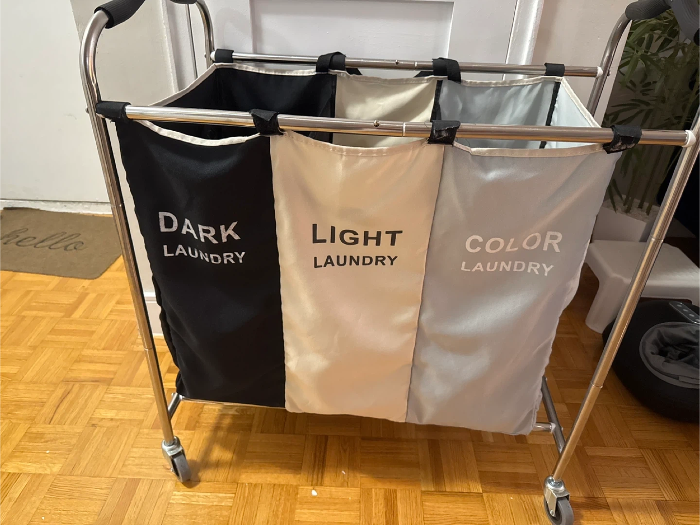 This rolling laundry sorter cart is perfect for keeping your laundry organized! It features three sections labeled for dark, light, and coloured laundry. The frame is sturdy with 5 horizontal bars, and the cart measures approximately 35 inches tall, 30 inches wide, and 16.5 inches deep. The colour is white.