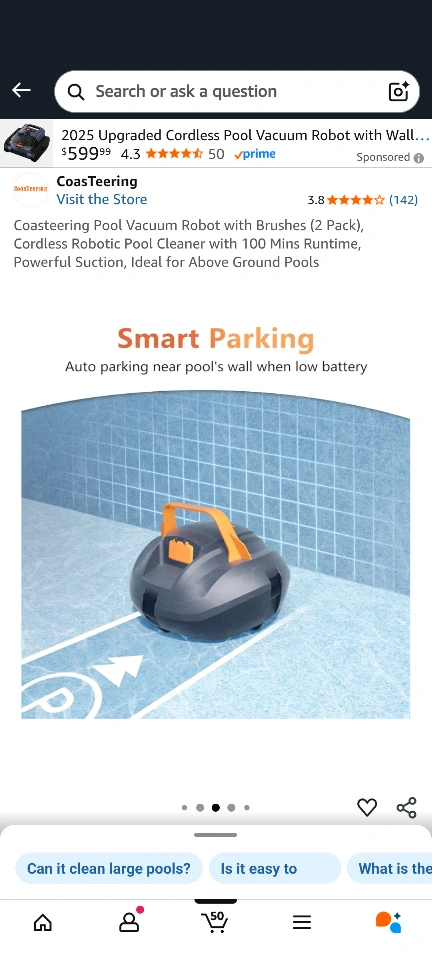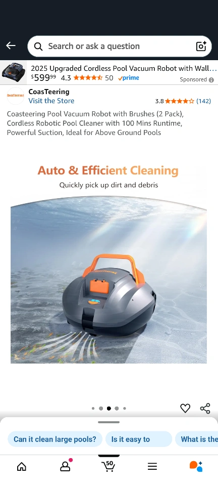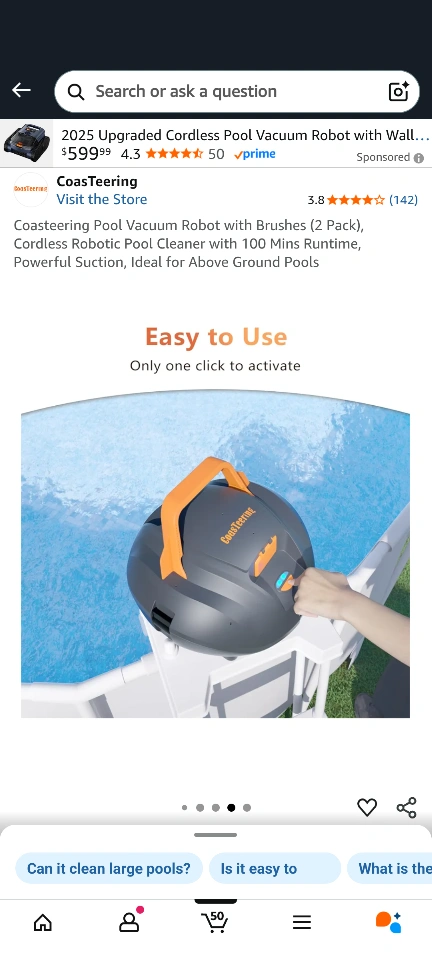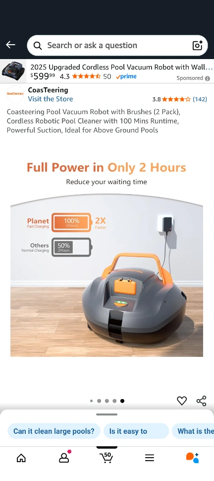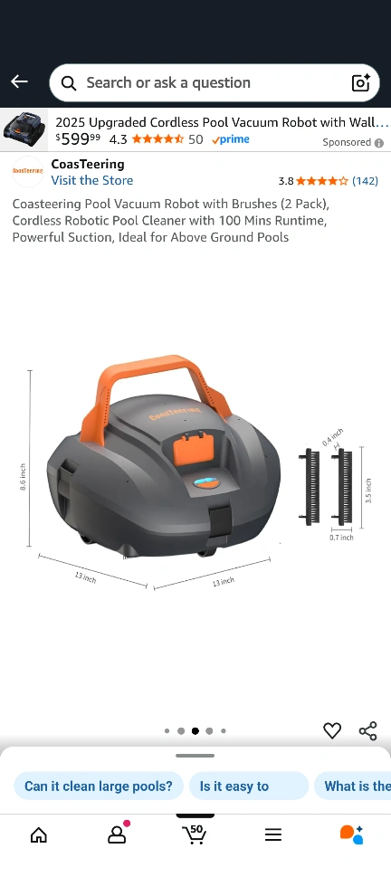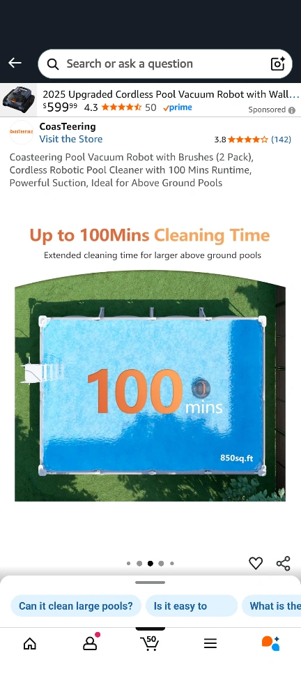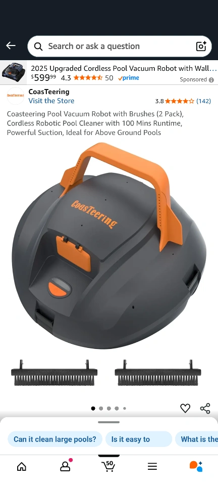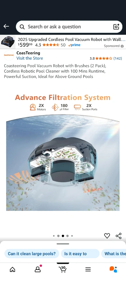 Coasteering Pool Vacuum Robot with Brushes (2 Pack), Cordless Robotic Pool Cleaner with 100 Mins Runtime, Powerful Suction, Ideal for Above Ground Pools. It has an advance filtration system and up to 100 minutes cleaning time.