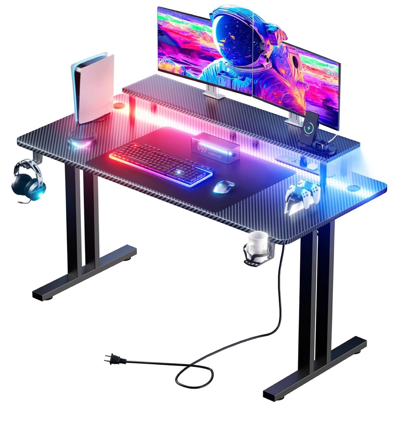 đ¸ brand new in box Can open for you to check price firm⌠the Power Outlet on the left or right? Not sure ăGaming Desk with Monitor Stand & LED LightsăThis gaming desk is featured with a monitor stand, which increases desktop space for all kinds of desktop items and gaming peripherals, protects your neck and back health for those who need to use the computer for long periods of time; Below the monitor stand is equipped with a strip of LED lights that can be controlled remotely via an APP(<10 meters), with more than 6000 colors and 200 lighting modes, creating the ultimate sense of ambience for you; The lights are made of efficient and energy-saving LED strips to save the power. ăComputer Desk with Power OutletsăFeaturing with 3 AC outlets and 2 USB ports, this computer desk allows you to charge devices such as phones and laptops without worrying about interruptions during work and play; Located at the desk's top right corner, you can connect the device into the power supply while sitting in your chair; 6.6-Feet power cord gives you flexibility in positioning your gaming desk; 2 cable management holes on both sides of the desktop to neatly conceal cables, keeping the desktop tidy and orderly. ăLarge desktopăLarge gaming desk sized 47" W x 24" D x 29" H, which is made of 0.6 Inch thickeness high quality carbon fibre, wear-resistant, easy to clean, high load-bearing, long hours of use will not heat up; This computer gamer desk is paired with a large anti-slip mouse pad, headphone hooks and cup holder which is convenient to hold your headphones, bag or drinks. ăSturdy & Steady Gaming TableăThe gaming table is made of 0.8 inch steel frame and triangular bracket construction with ultra-stable double-T legs, the tabletop is supported by a sturdy steel frame, anti-pressure and anti-deformation, load-bearing up to 200 pounds, no fear of placing all kinds of large-scale gaming equipment! The adjustable rounded foot pads ensure the table keeps a sturdy construction on uneven ground, fully satisfying the needs of players.